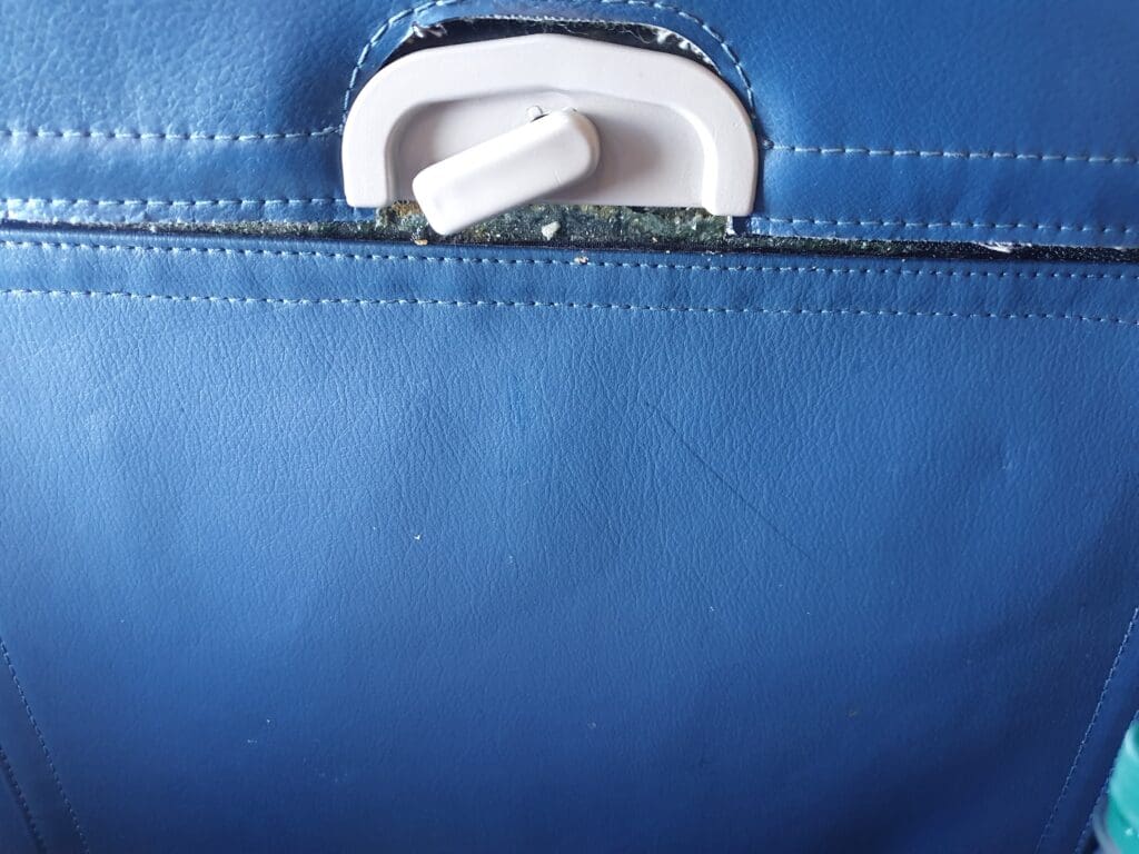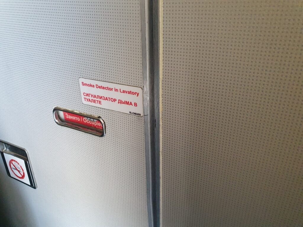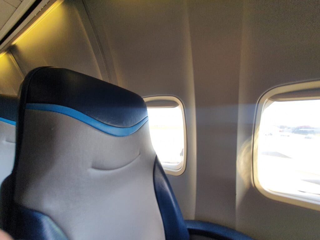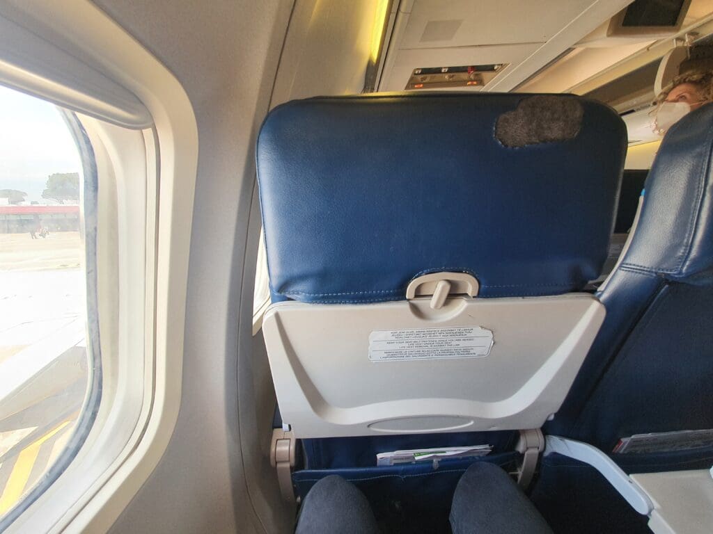 From the rear of the aircraft it did not take too long for me to reach my row, and upon arriving there I found that I already had two seatmates in 23B and C. After taking my seat, I was pleased to find this to be nicely soft and offer a reasonable amount of legroom for a low-cost carrier, whilst the area around this appeared to be clean despite the aircraft’s short turnaround time. Turning to the seatback pocket, this was full, containing the safety card, a menu, an Albawings branded sickbag, a leaflet regarding COVID-19 as well as the now rare sight of a real inflight magazine! However, unfortunately, not all was positive, the cabin appeared to be in a very battered and worn state, with plenty of marks and scratches, and a patch of the seat cover was missing from the back of the seat in front of mine. However, expecting some signs of the aircraft’s age to be present in the cabin, I was neither surprised nor particularly bothered by this. Interestingly, whilst the aircraft ended its service in Russia several years ago and had served for Go2Sky since leaving S7 Airlines, several Russian signs could still be seen in the cabin.