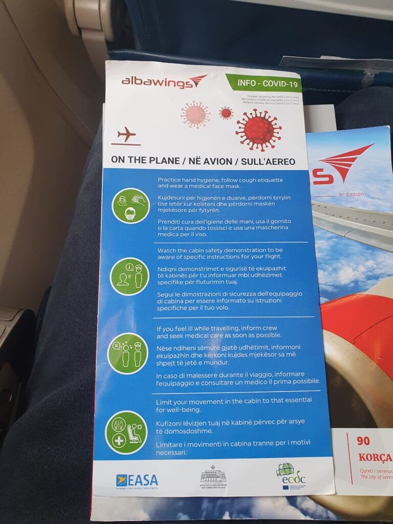 Once seated and strapped in, from my position on the left-hand side of the aircraft, I watched as passengers made their way over from the terminal – with the flow of passengers turning to a trickle as the scheduled departure time neared. In preparation for our departure, the rear stairs were pulled away from the aircraft and just after 1500, the final three passengers slowly trundled out to the jet. Once they had made their way into the cabin, a flight attendant performed an announcement regarding the compulsory wearing of FFP2 face masks whilst onboard, first in Albanian and then in English. A few minutes after the cabin door at the front of the aircraft was closed, the Purser made a longer welcome announcement in Albanian and English during which they mentioned that the flight time to Tirana would be an hour and ten minutes.