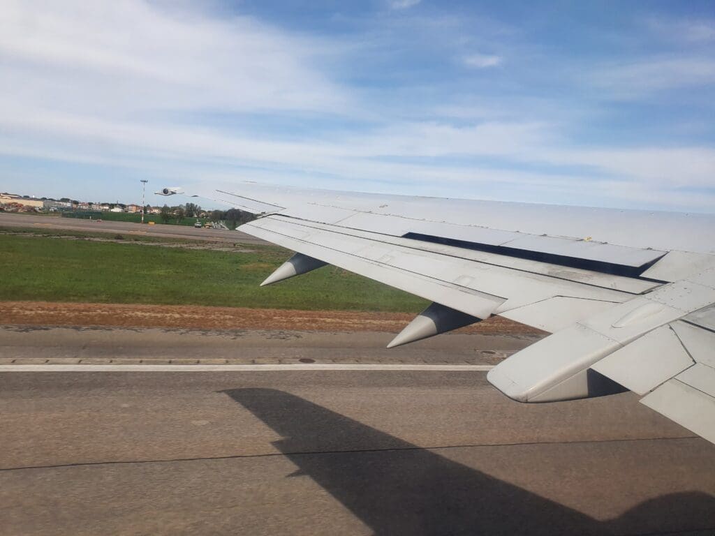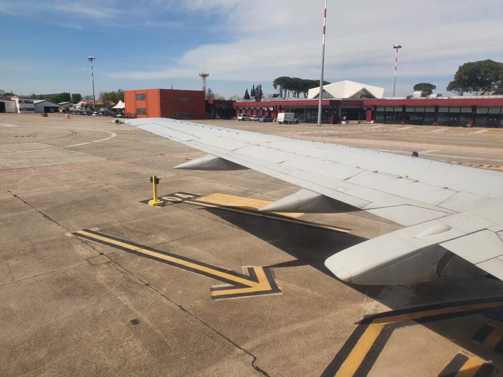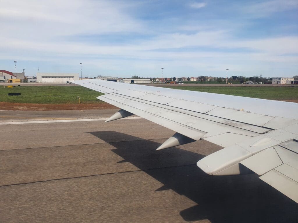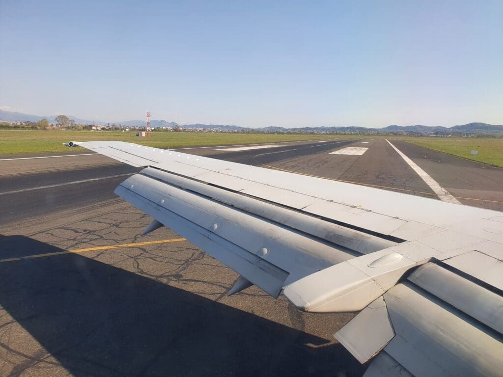 A couple of minutes after the Purser had completed their main welcome announcement, they took to the cabin speakers once again as they began to read through the safety instructions whilst the other three crew members performed a demonstration in the aisle. As the demonstration was underway, the Boeing’s two CFM56-3C1 could be heard powering up and vibrating into life resulting in a reasonable amount of noise whilst the scent of jet fuel filled the cabin. In addition, I also noticed the cabin to become rather hot at this time however fortunately my air vent worked without an issue. As the crew passed through the cabin ensuring all was in place for the aircraft’s departure, at 1506 the aircraft powered forwards out of its stand and quickly turned right, being much of Professione Volare’s fleet of light aircraft into view before the Boeing made a very quick taxi over to holding point bravo.