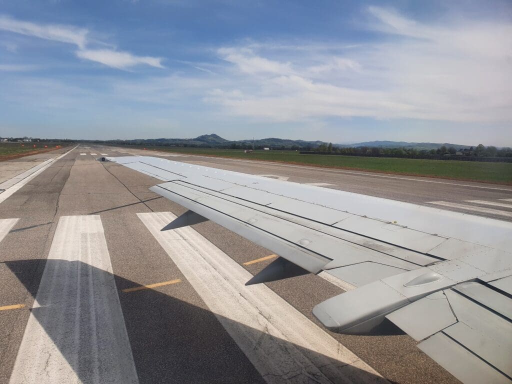 No more than a minute after the Boeing had left its stand, the aircraft came to a halt at the holding point where it waited for three minutes. Following this wait, the aircraft made its way onto the runway at 1510 and turned right, commencing a speedy backtrack to the end of this before turning around. Without stopping, once pointing in the correct direction, the Boeing’s two CFM International engines roared into life as the jet began a powerful rolling takeoff down Runway 12. That afternoon, the Boeing seemed to use most of Forlì’s 2.5-kilometre runway before reassuringly rotating upwards and rocketing upwards into the skies of Italy. Passing over the airport’s perimeter fence a few moments later, the Boeing passed over the nearby town of Forlimpopoli which dates back to 132 BC.