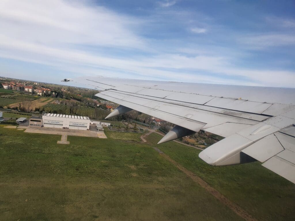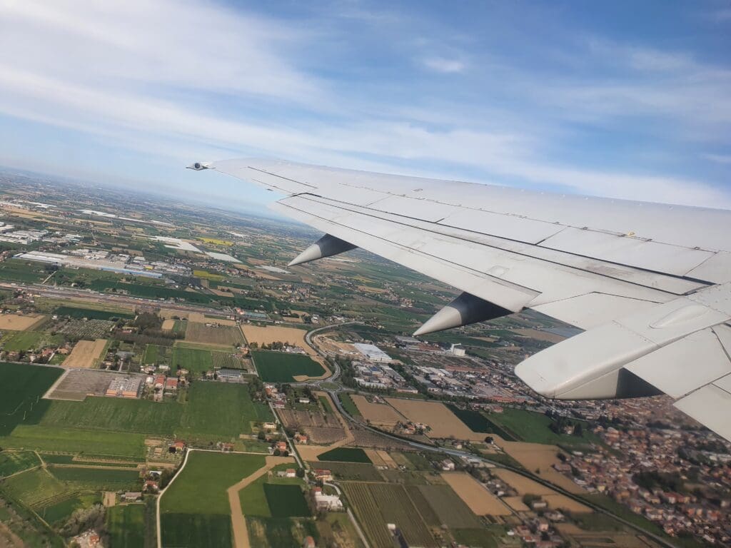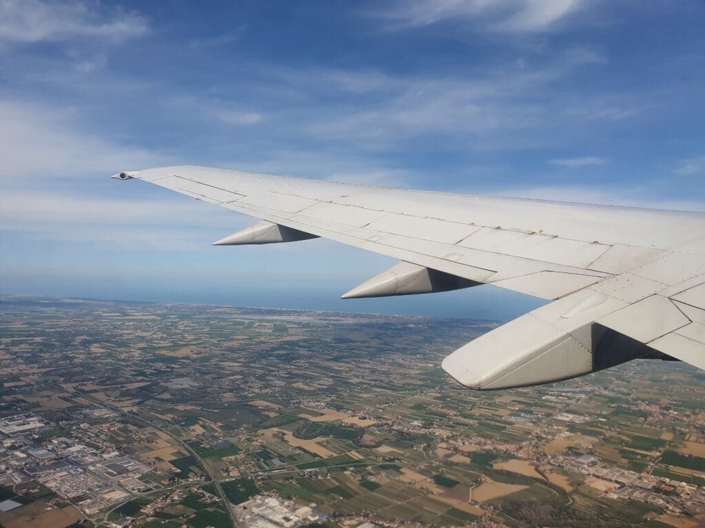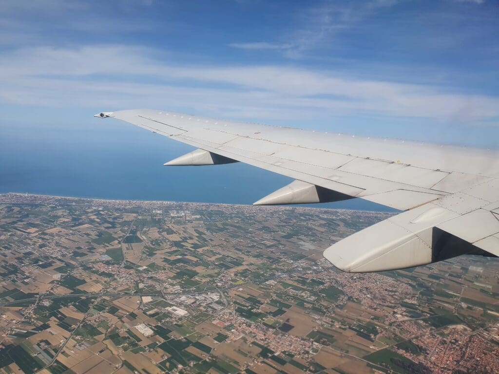 From Forlimpopoli, the Boeing made a smooth climb over the green fields of Emilia-Romagna, flying roughly parallel to the E55 motorway which runs all the way from the Swedish city of Helsingborg, all the way to Kalamáta in Greece – albeit with three ferry crossings on the way. With Forlì sitting around 25 kilometres away from the coastline, no more than two minutes after taking to the skies, the blue waters of the Adriatic could be seen as the Boeing made its way southeast, flying along the coastline and allowing for a few of Eastern Italy’s beaches and seaside resorts for several minutes. As we made our way southwards, it wasn’t too long before the city of Rimini appeared hugging the coastline, accompanied by its airport. After leaving Rimini behind, the aircraft soon crossed from the skies of Emilia-Romagna to Marche at which point the coastal city of Pesaro could be seen.