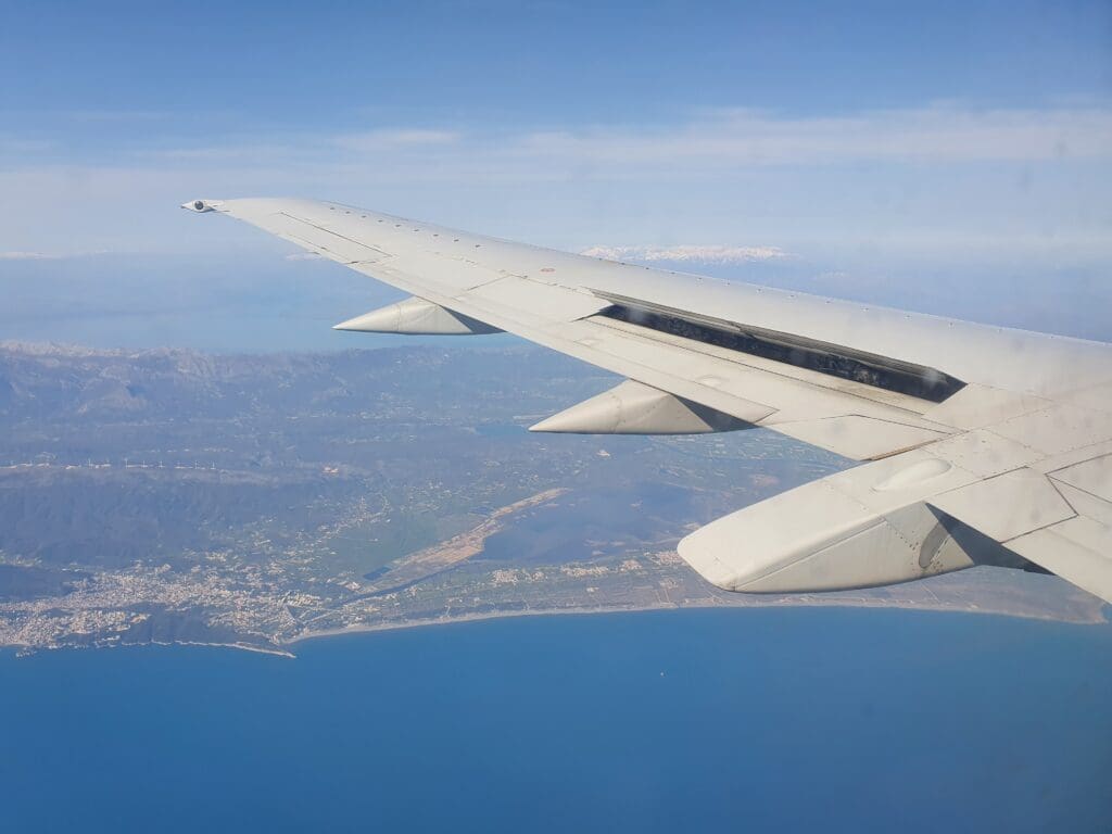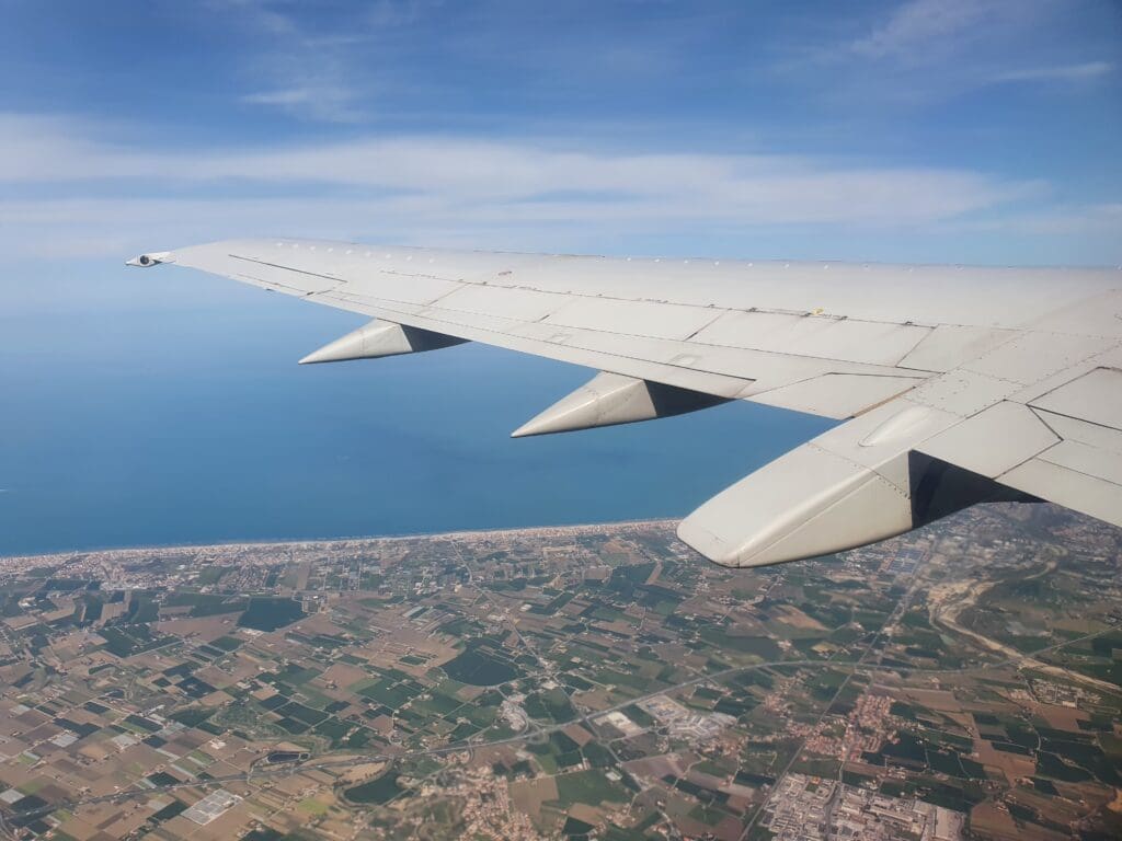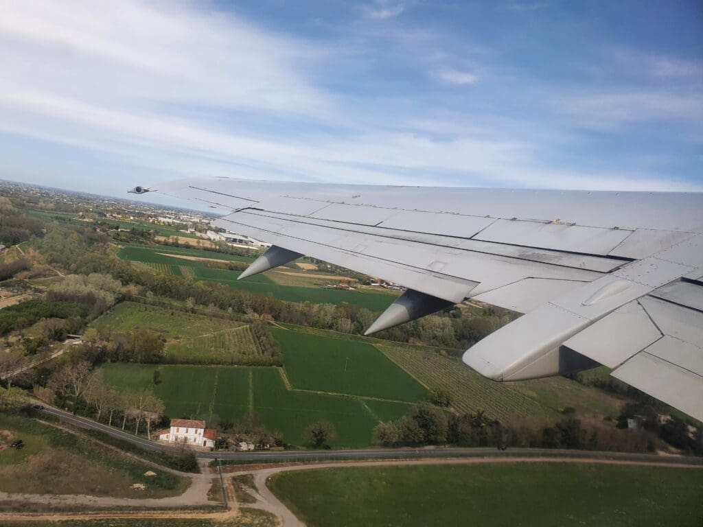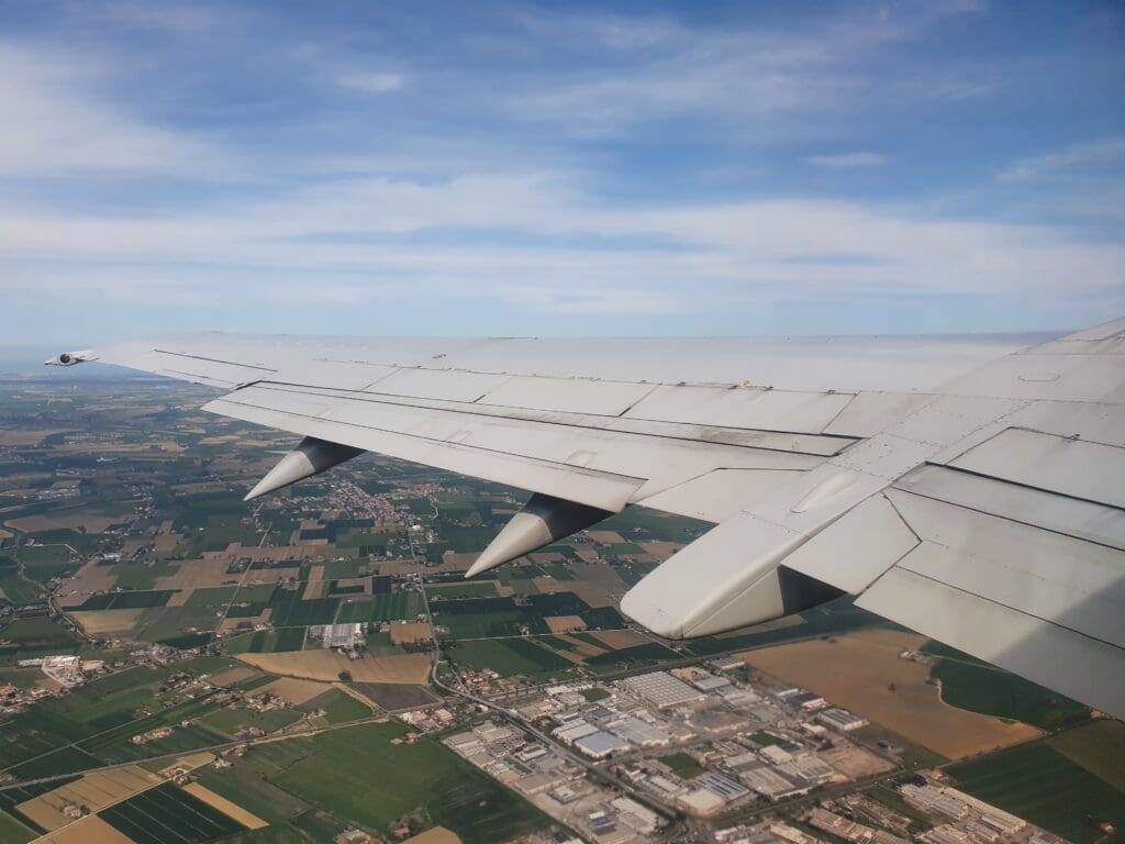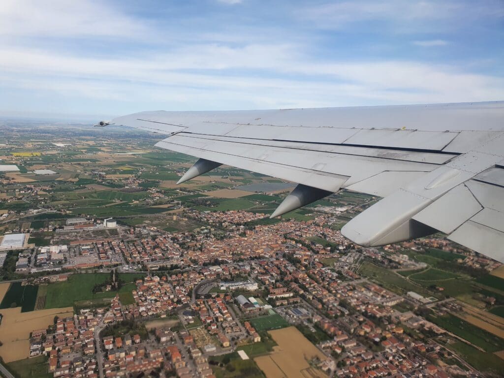 From Forlimpopoli, the Boeing made a smooth climb over the green fields of Emilia-Romagna, flying roughly parallel to the E55 motorway which runs all the way from the Swedish city of Helsingborg, all the way to Kalamáta in Greece – albeit with three ferry crossings on the way. With Forlì sitting around 25 kilometres away from the coastline, no more than two minutes after taking to the skies, the blue waters of the Adriatic could be seen as the Boeing made its way southeast, flying along the coastline and allowing for a few of Eastern Italy’s beaches and seaside resorts for several minutes. As we made our way southwards, it wasn’t too long before the city of Rimini appeared hugging the coastline, accompanied by its airport. After leaving Rimini behind, the aircraft soon crossed from the skies of Emilia-Romagna to Marche at which point the coastal city of Pesaro could be seen.