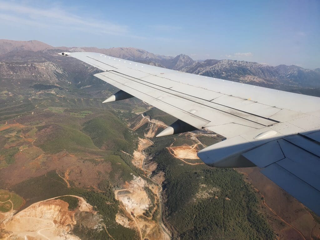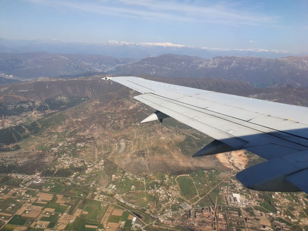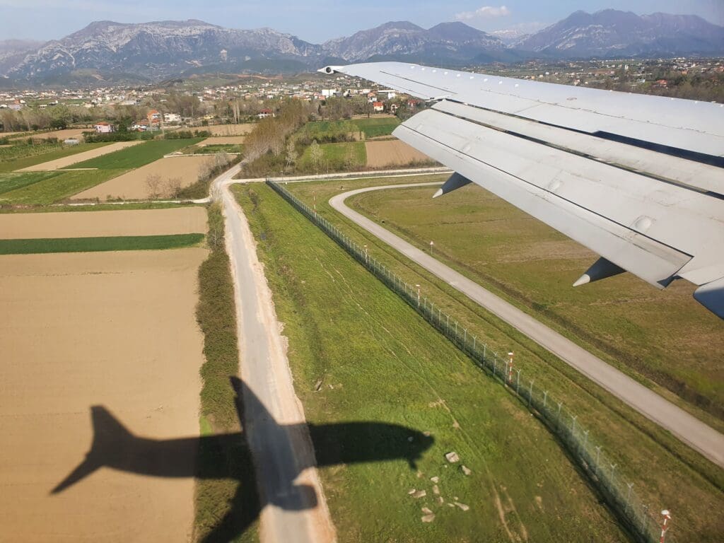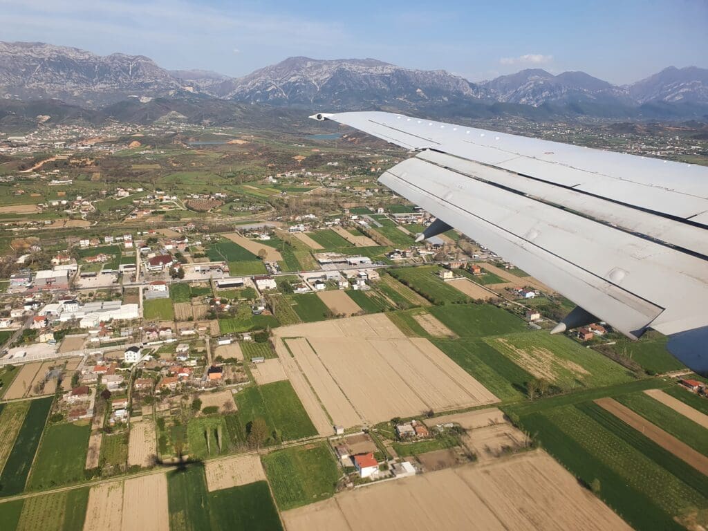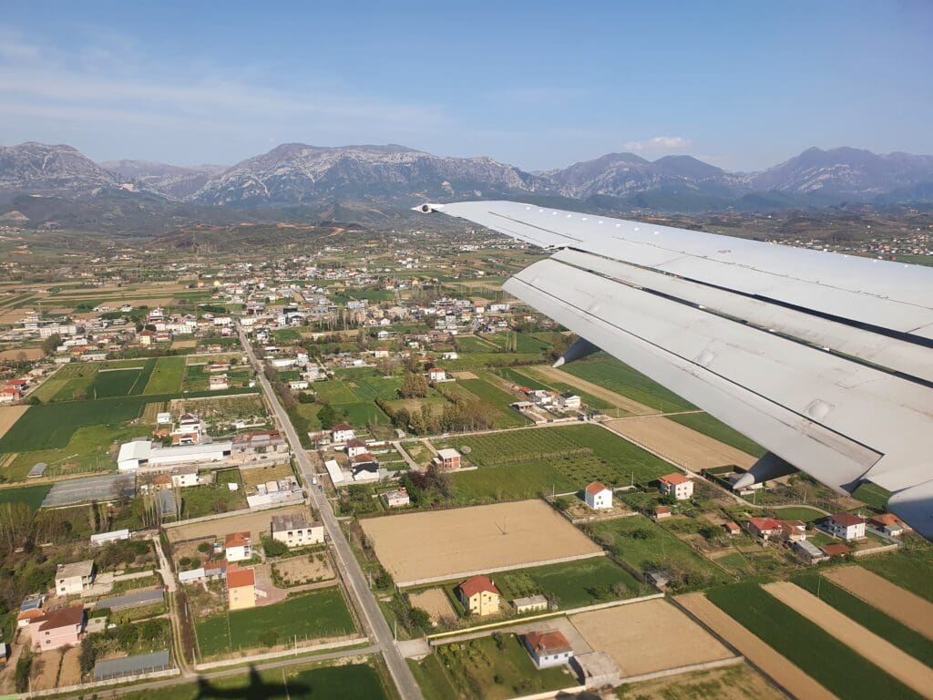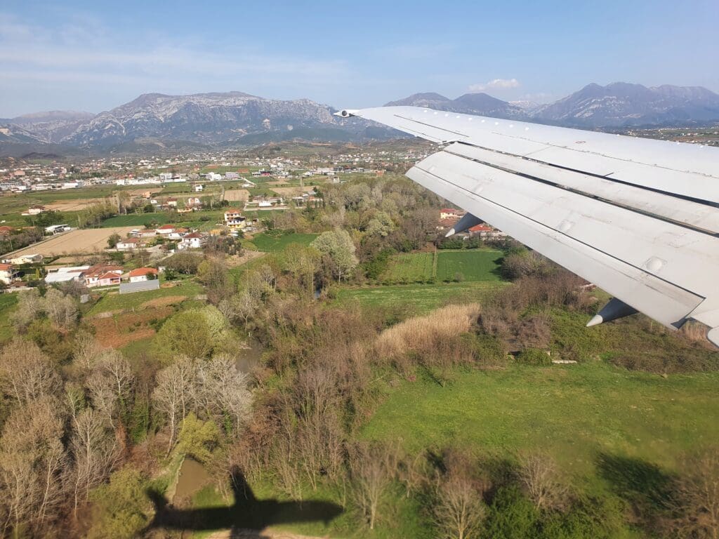 After passing the Montenegrin coastal town of Ulcinj, the hills of Albania’s rocky coastline around the town of Rrjolli could be seen before the aircraft crossed the coast just to the south of the town of Shëngjin. With this town serving to be a popular holiday destination, there, a long beach could be seen stretching down the coastline. From Shëngjin the Boeing turned southwards to line itself up from an approach to Tirana Airport’s Runway 17 whilst I was treated to spectacular views of the Albanian countryside, hills and mountains as we trundled towards the capital.