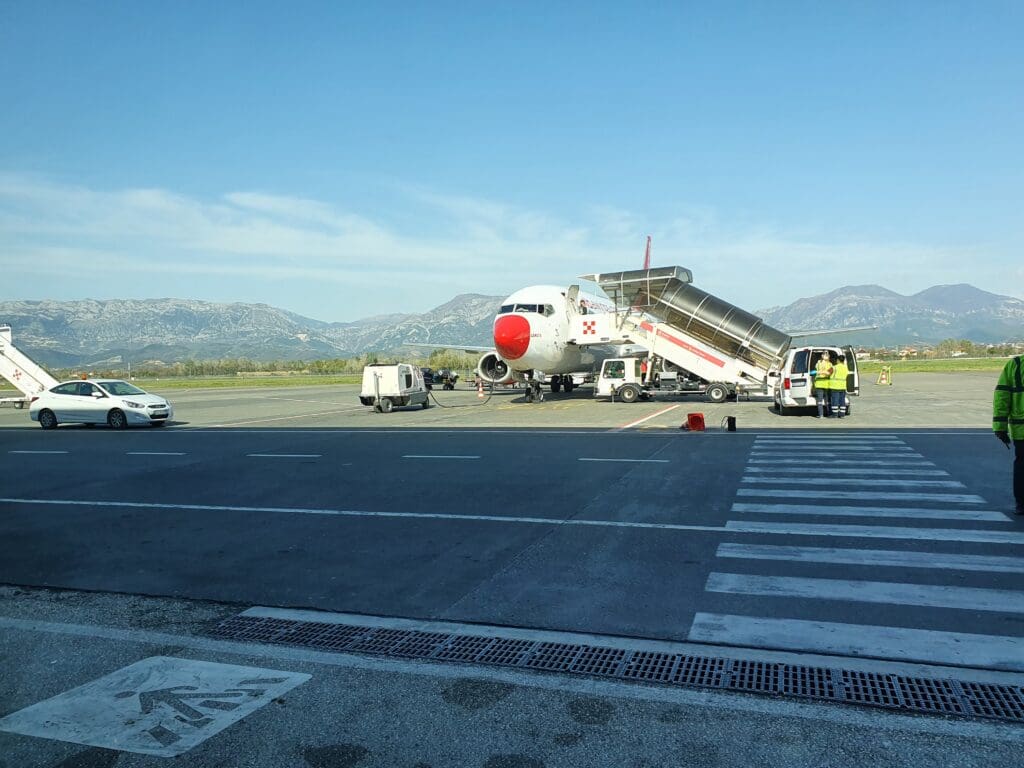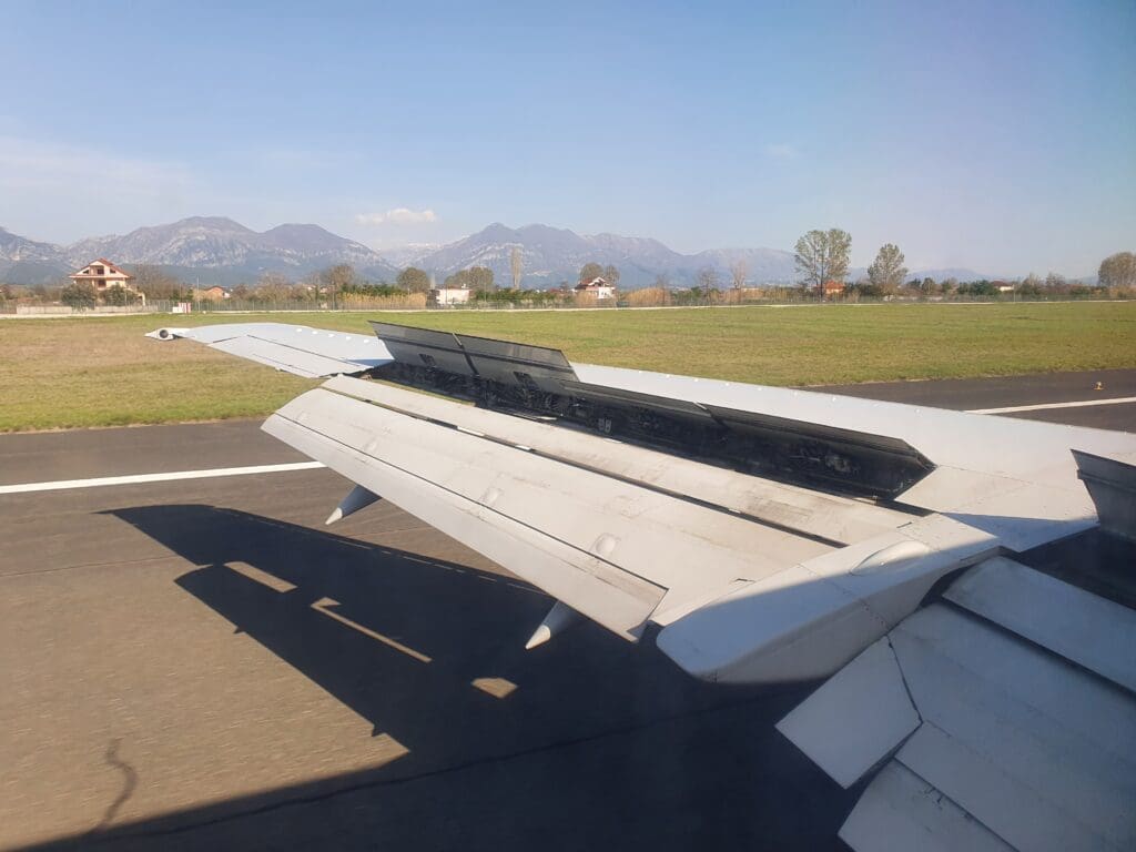 As the aircraft neared the airport, the hills flattened out a little and soon the flaps and landing gear were extended as we crossed over a cluster of villages sitting near the airport. Following an hour and three minutes in the air, at 1615 the Boeing crossed over Tirana Airport’s perimeter fence and touched down with a gentle bump on Tirana Airport’s Runway 17. Once on the ground, the sound of the engines filled the cabin as the reverse thrust was applied and the jet decelerated rather quickly before vacating the runway to the right and following a follow-me car to the terminal. In the usual matter, at this time a flight attendant welcomed all to Tirana and thanked passengers for flying with Albawings.