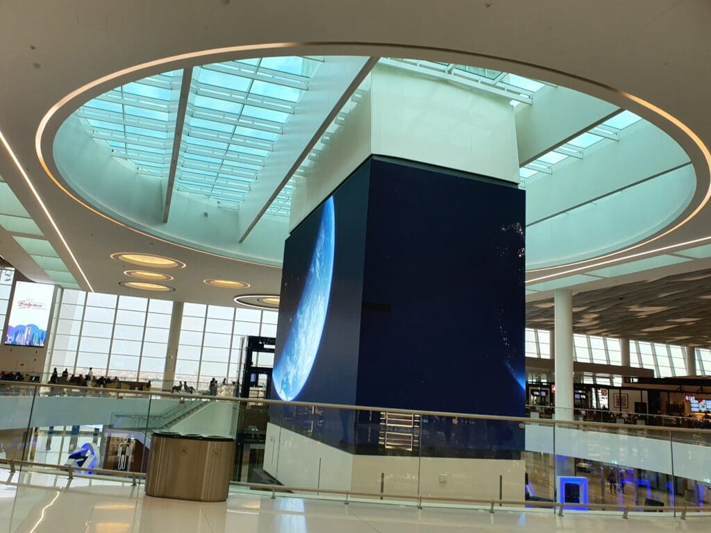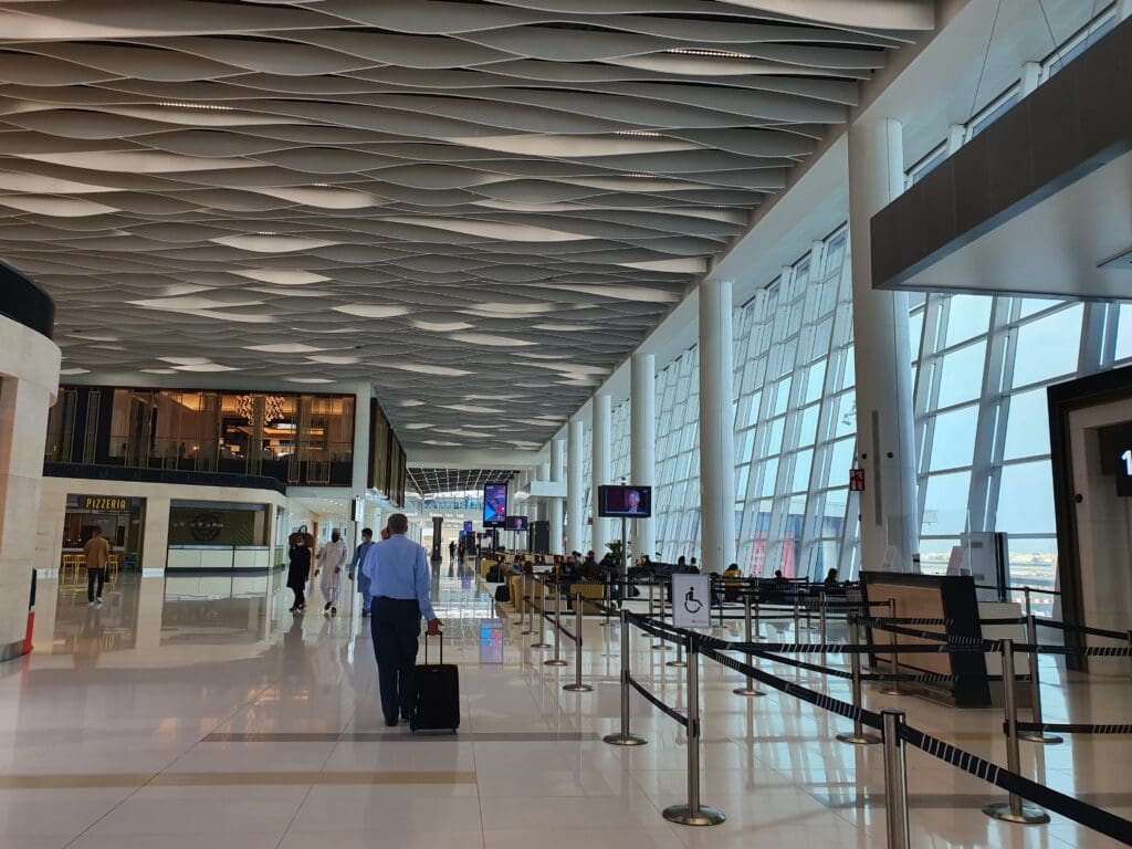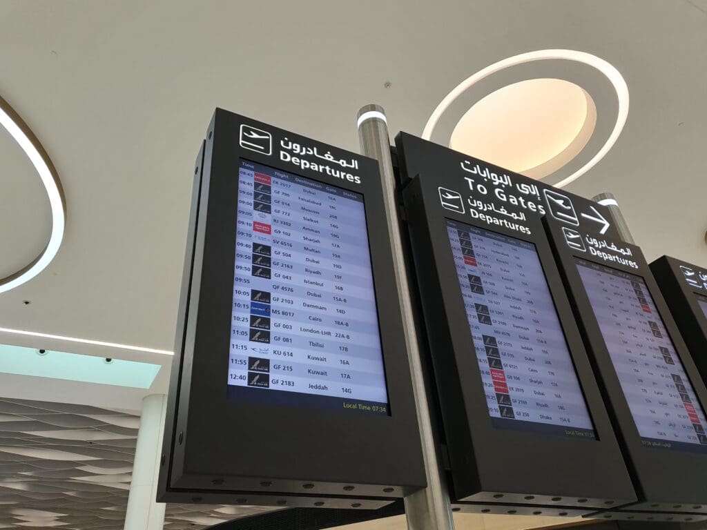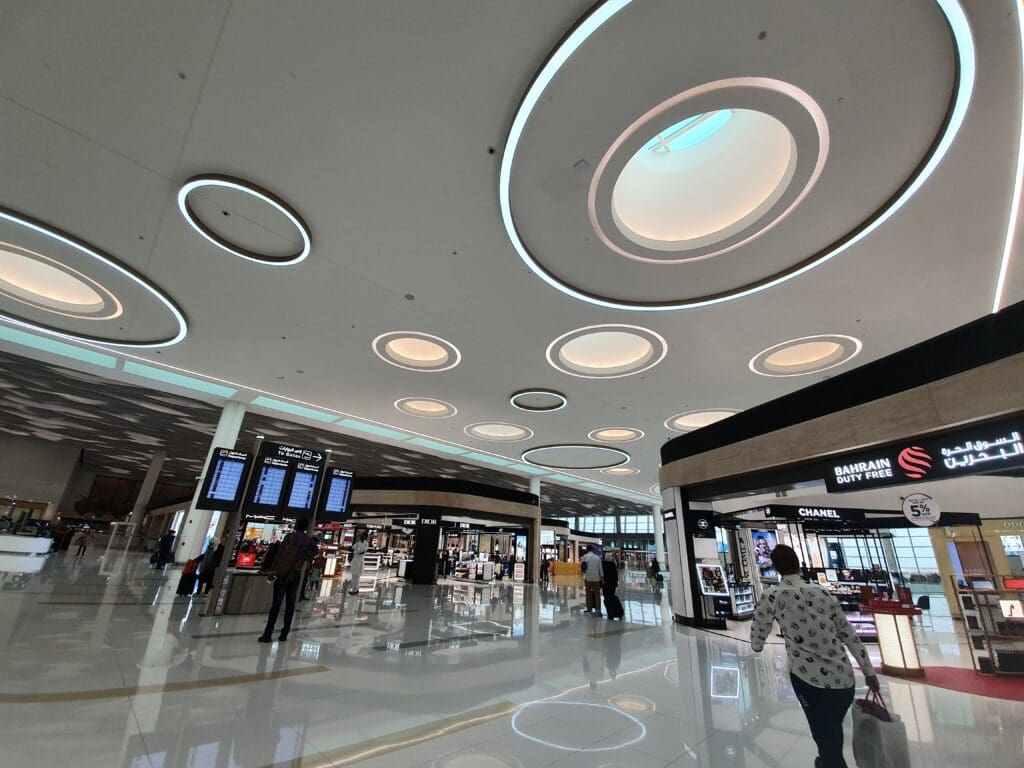 Following a short and pleasant hop over from Dubai onboard one of Gulf Air’s Airbus A320neos, I walked up the jet bridge and entered Bahrain’s modern terminal. Having arrived at gate sixteen near the centre of the terminal, once in this I did not have far until I reached the atrium where those ending their journey in Bahrain are siphoned off from those who are connecting to other services. Falling into the latter category, after a quick toilet stop I made my way up the escalators into the terminal’s security hall. Unlike at many airports, those who are connecting in Bahrain must undergo a security check before being allowed to re-enter the terminal’s airside area. Having arrived at a fairly busy time for arrivals, a long snaking queue of passengers, both connecting and commencing their journeys in Bahrain, could be seen. With only a small number of checkpoints open for Economy passengers, it took some time until I was able to reach one of these. Finally, around 25 minutes after joining the security queue, I was free to explore the delights of Bahrain Airport.