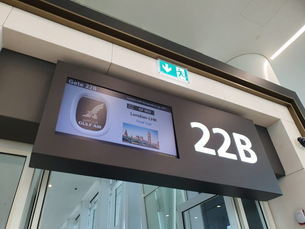 With boarding scheduled to commence forty minutes before departure at 0945, having charged my phone at 0900 I slowly trundled over to Gate 22, located at the southeastern tip of the terminal. As I approached this, it became clear that this was no ordinary gate, with those heading to this required to pass through an additional security check before entering the gate area, something which I had only thought was the norm on flights to the US. Despite my early arrival at the gate, an army of Gulf Air staff could be seen welcoming passengers and I soon walked up to one of the gate agents who requested to see my boarding pass, passport and Passenger Locator form. Once these had all been checked, I joined the short queue for the sole security checkpoint and soon passed through this without any issue. Once at the gate, I found this to contain nothing other than seating and windows offering views of the apron and runway, with no toilets or other facilities. Whilst this was not an issue, seeing as passengers were being let into this area well before boarding, I do think it could have been advisable for a sign to be erected informing passengers of the lack of toilets in this area, or at least staff members could have advised passengers about this.