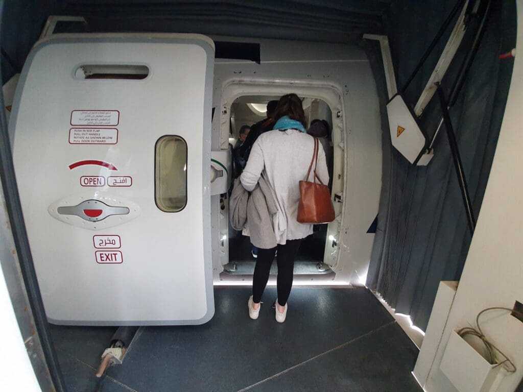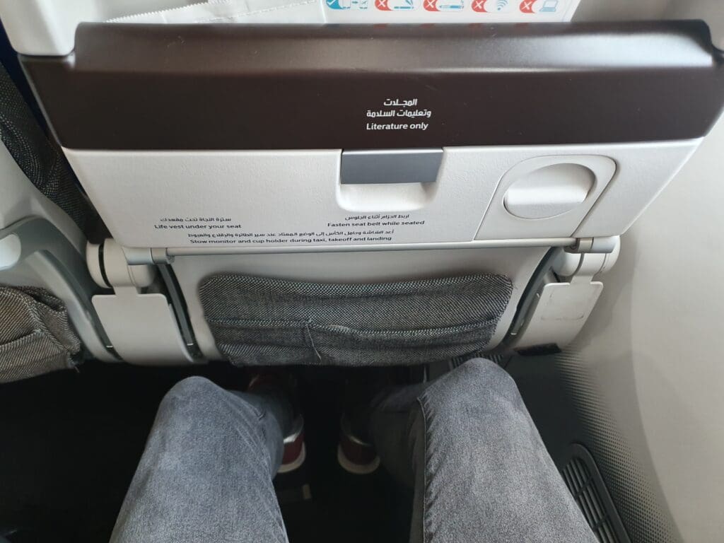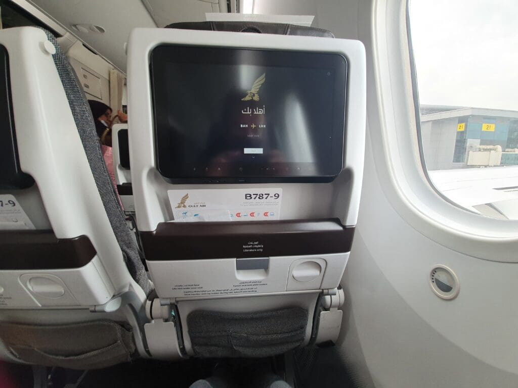 As I made my way through the Economy cabin, classical music rang out and I passed two flight attendants who provided nothing by means of a greeting as I journeyed to my seat. However, upon arriving in the rear Economy cabin, I was warmly welcomed by a flight attendant who requested to see my boarding pass and then guided me to my seat, 43K – offering an impressive level of service that they attempted to maintain as more and more passengers streamed into the aircraft. Upon sitting down and settling in, whilst I knew what to expect having recently travelled on Gulf Air’s Airbus A320neo and Airbus A321neo aircraft, I found the seat to be expectedly comfortable, well padded and featuring a decent amount of legroom. However, I did spot a reasonable number of marks and scratches around my seat, as well as a few crumbs and a headphone prong in the seatback pocket. After sitting down, passengers continued to stream onto the aircraft however the two seats next to me remained vacant giving me hope that I would enjoy unobstructed window and aisle access for the entire flight. Indeed, this turned out to be the case and I estimate the load to have been around 70% in Economy. That day, many of those on board appeared to be either travelling from Pakistan to the UK, as well as point-to-point travellers that had commenced their journeys in Bahrain. Slightly surprisingly, few passengers appeared to have commenced their journey in Dubai as I had done.