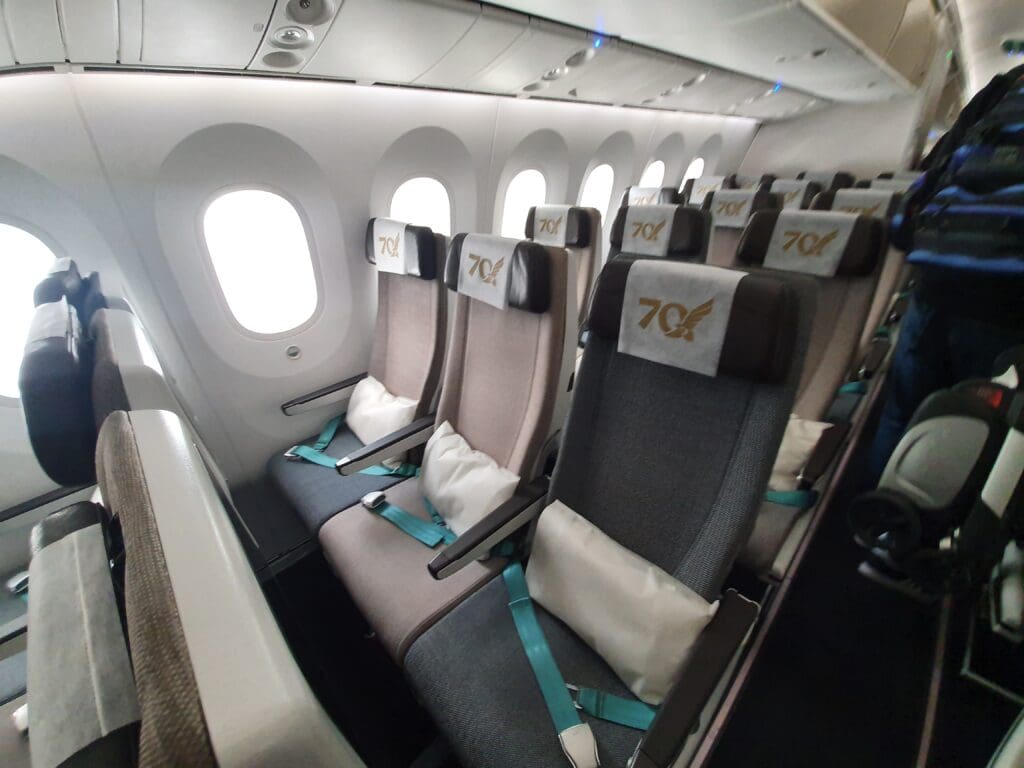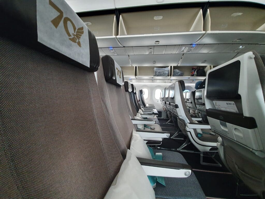Seeing as my boarding pass had already been scanned, once those in Economy had been invited to board, I walked straight down the jetway and without any queuing I stepped into the aircraft via the L2 door, entering this at the spacious atrium area at the rear of the Falcon Gold cabin. Upon stepping onto the aircraft, I received a warm greeting from the Cabin Services Manager who advised me on how to reach my seat. Inside, Gulf Air’s Dreamliners feature 26 Apex suites, all of which are located in the forwardmost section of the aircraft between the L1 and L2 doors. Thus, with no premium economy cabin, upon turning right down the second aisle, I immediately entered the aircraft’s forward Economy cabin.