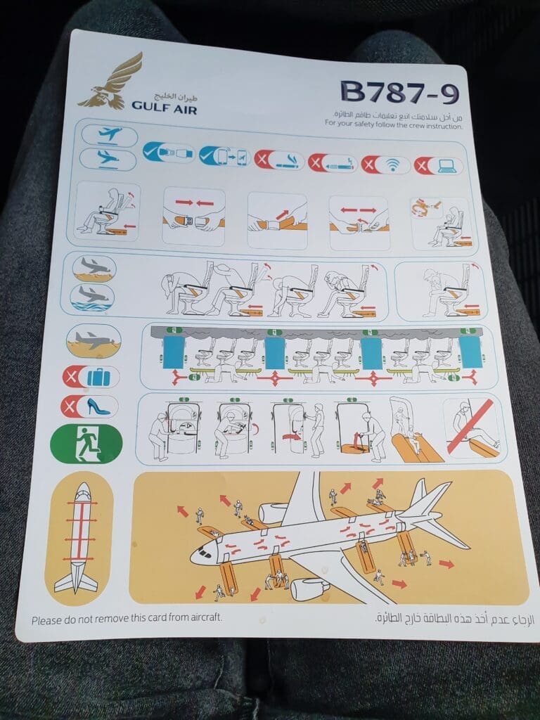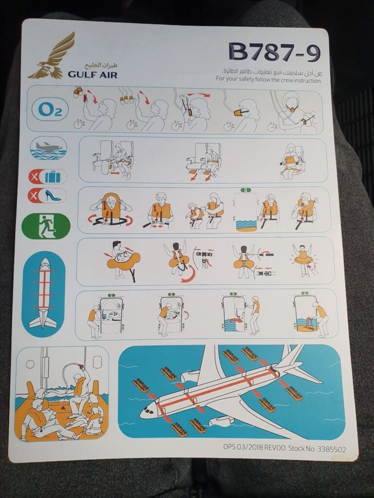At 1020 the crew passed through the cabin distributing Gulf Air’s relatively decent quality packaged blankets, followed several minutes later by the distribution of headphones. At the flight’s scheduled departure time of 1025, the Cabin Services Manager performed their welcome speech first in Arabic and then again in English indicating that boarding was complete. Meanwhile, aside from the cones around the jet, outside all appeared to be ready for our departure. However, indicating that some baggage would need to be offloaded, a few minutes later, a baggage ramp could be seen being repositioned up to the aircraft. Inside the cabin, at this time, a prayer was broadcast and followed by Gulf Air’s long safety video which detailed the safety instructions in Arabic and English. Turning my attention back outside, I watched as an army of hardworking ground staff unloaded two containers and searched these, presumably in search of missing passengers’ bags. Meanwhile, confirming this, at 1038, the Captain performed a welcome announcement in English, during which they advised that there were three missing passengers and their bags were in the process of being offloaded.