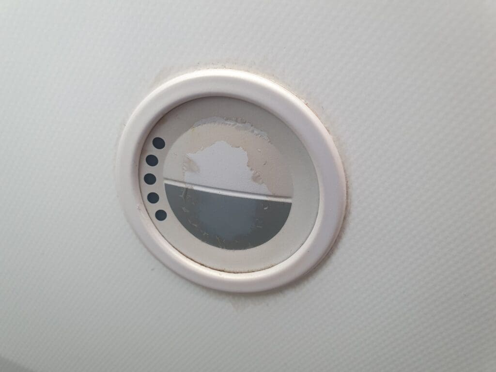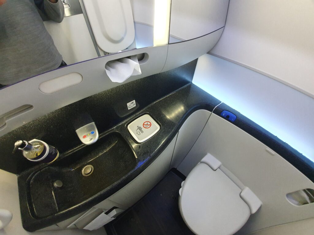 Following my explore of the inflight entertainment system, I drifted in and out of sleep as the aircraft cut across Turkey, heading from the southeast to the northwest of the country, passing over Ankara and Istanbul before reaching Europe and crossing into Bulgarian airspace to the south of Burgas. Whilst clouds remained firmly in place beneath the aircraft for much of the thirty-minute crossing of Bulgaria, as the Dreamliner soared over the country’s Montana Province and approached the border with Serbia, these parted and revealed hilly landscapes which soon rose into Serbia’s Carpathian and Balkan Mountains. Unfortunately, the gap in the clouds did not last too long with little to be seen outside once the aircraft crossed into the airspace of Bosnia and Herzegovina. At this stage in the flight, the first drinks round since the post-lunch round was undertaken, during which trays of plastic cups containing apple juice, orange juice, Coca Cola and water were passed through the cabin. After drinking a cup of refreshing apple juice, I opted to visit one of the lavatories positioned between the two Economy cabins and was pleased to find this to be in a good state – clean, stocked with everything you would expect in an aircraft lavatory and with few noticeable signs of wear and tear.