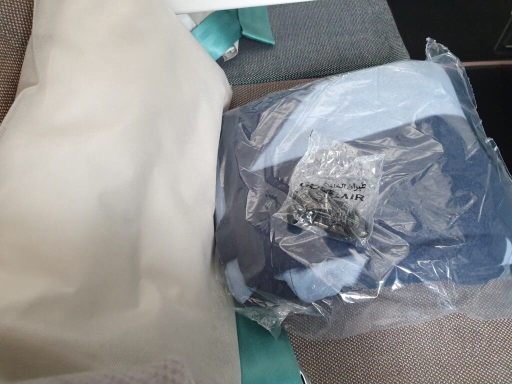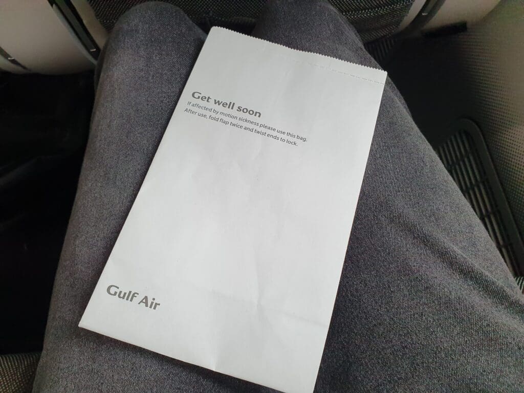 For those in Falcon Gold, there exist some discrepancies between the types of seats and suites featured onboard Gulf Air’s Airbus A320neo, Airbus A321neo and Boeing 787-9 aircraft. However, in Economy each of these features a virtually identical seat, the modern squarish Recaro CL3710, with each of these covered in either a grey or brown fabric and features an adjustable (faux?) leather headrest topped with a disposable fabric antimacassar advertising Gulf Air’s 70th anniversary could be seen. As well as a tray table, seatback pocket, literature compartment – containing a safety card and a sick bag, and a cup holder, the rear of each seat features a large and high-quality 10-inch wide personal inflight entertainment screen, powered by Thales’ AVANT inflight entertainment system. Meanwhile, onboard their Dreamliners, Gulf Air has opted for a 3-3-3 configuration in Economy. Upon boarding, a typically Economy class quality pillow could be seen on each seat, however unlike on the service from Frankfurt to Bahrain, no amenity kit was provided.