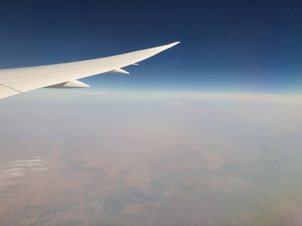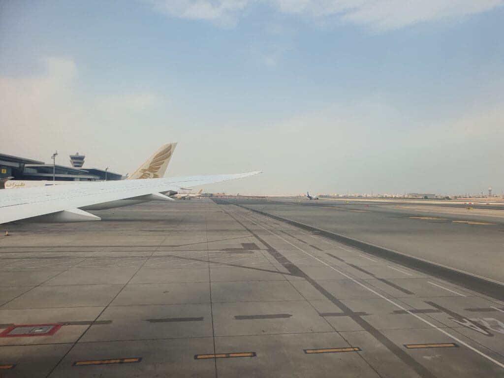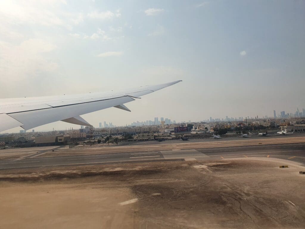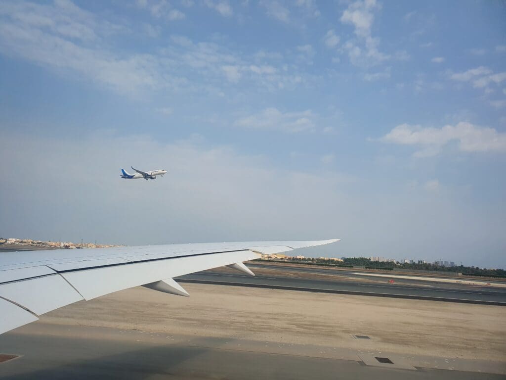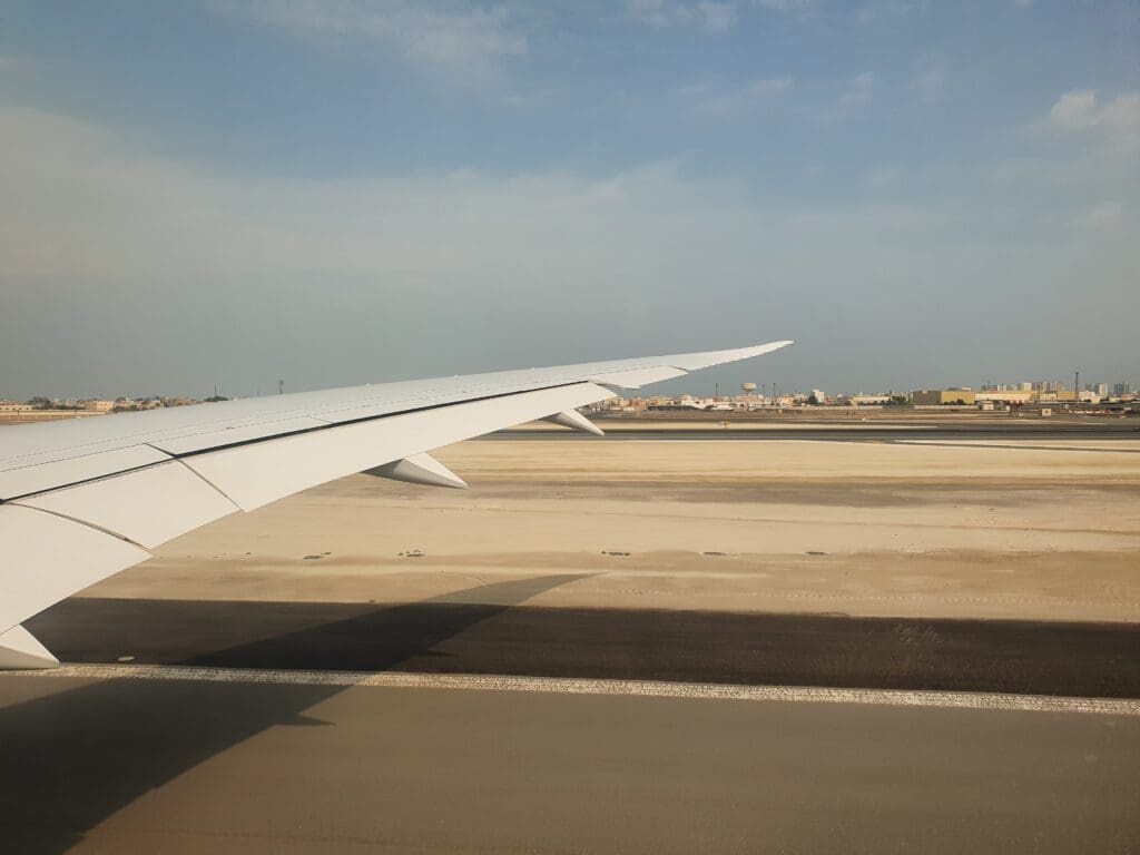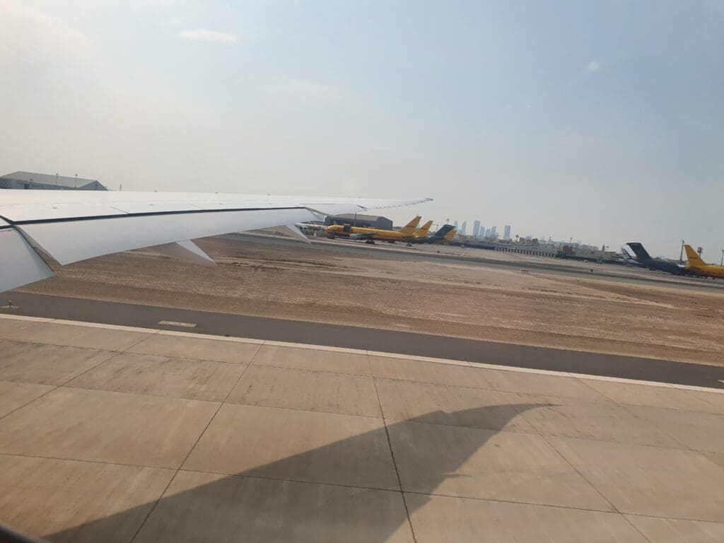 At 1047, 22 minutes behind schedule the Boeing jolted backwards and the Dreamliner’s two Rolls-Royce Trent 1000 engines whirred and hummed into life as the cabin lights were dimmed before transitioning to dark blue mood lighting. Perhaps somewhat illogically given the usual requirement to keep window shades open for departure, at this time the windows were set by the cabin crew to their darkest possible setting, however, thankfully this could be overridden by passengers. After several minutes, the aircraft slowly travelled parallel to the terminal along Bahrain Airport’s disused Runway 12R/30L. Seated on the right-hand side of the aircraft, I was on the wrong side to receive any decent views of the interesting aircraft parked on the ground during our journey to the runaway. Several minutes later, the aircraft slowly turned right onto taxiway A1 before making its way onto the runway without pausing. At this time, a collection of aircraft sitting on the military and cargo ramp could be seen which included one of the US Air Force’s Air Force One liveried Boeing VC-32, which was in town supporting the United States Defence Chief, Lloyd Austin’s visit to Bahrain, as well as two Charleston-based Boeing C-17 Globemasters.