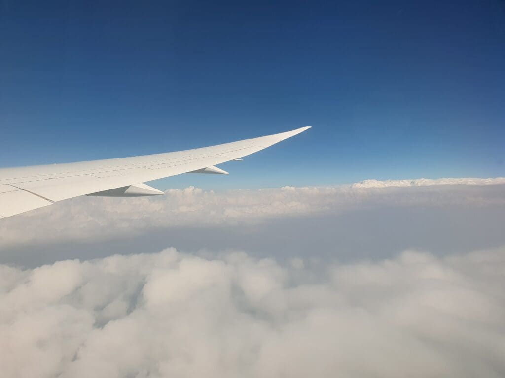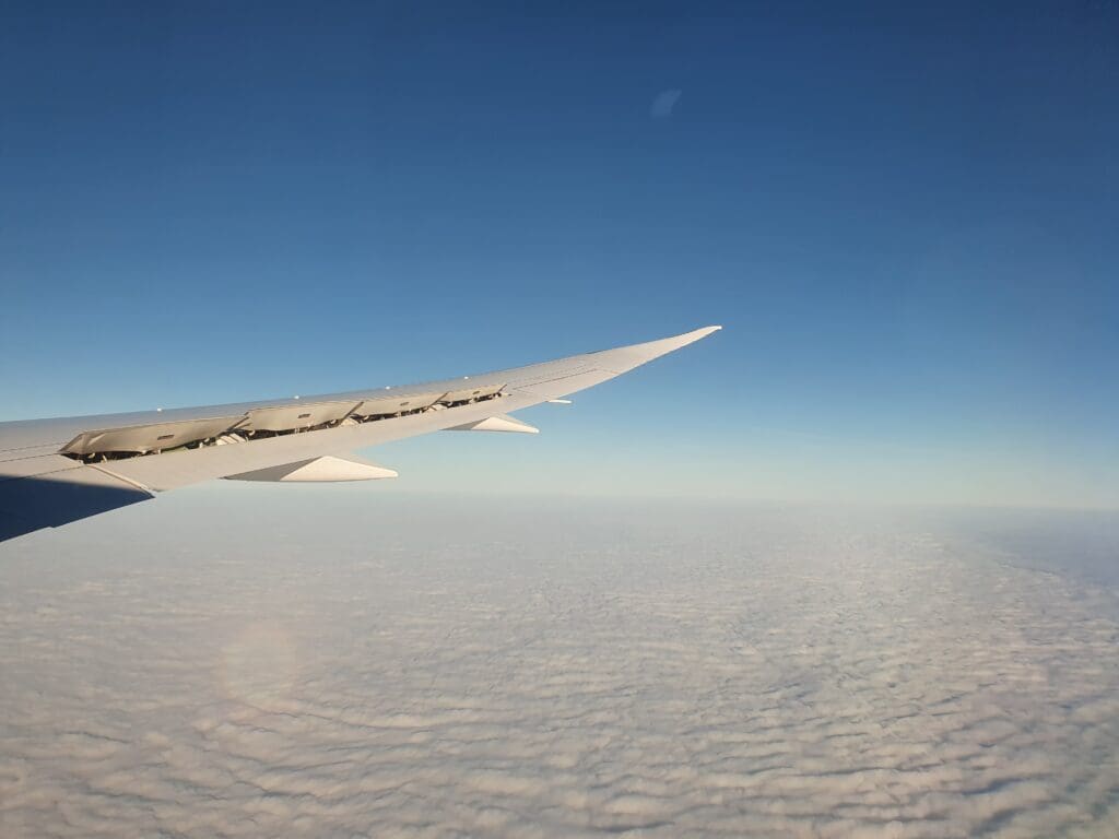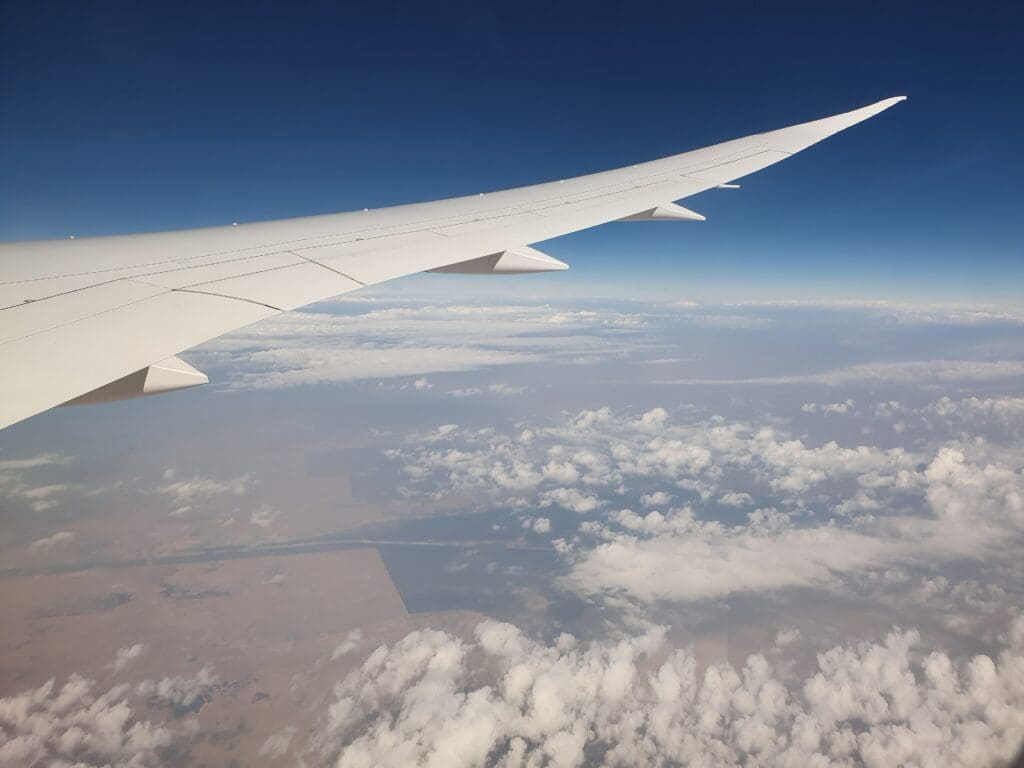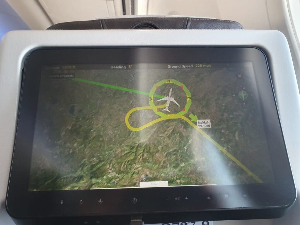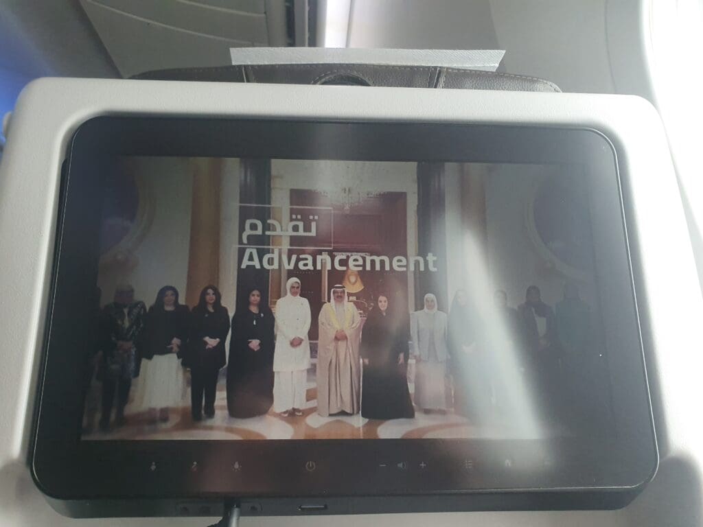 As the Dreamliner cut through the white clouds, the Cabin Services Manager performed another welcome announcement in Arabic and English, during which several members of the cabin crew were introduced by name, and the languages spoken by all members were listed, these being French, Greek, Hindi, Romanian, Serbian and Slovakian, alongside of course Arabic and English. After this was completed, a COVID-19-related health and safety video was played on all personal television screens as well as those at the front of the cabin, which was followed by a short government video commemorating the Supreme Council for Women’s twentieth anniversary. After this, the inflight entertainment system became usable once again and the seatbelt signs were extinguished as we ascended through 10,000 feet.