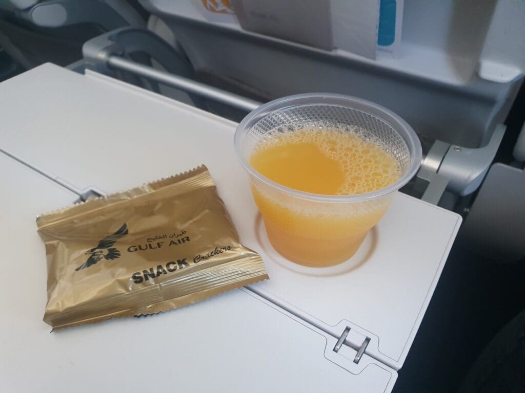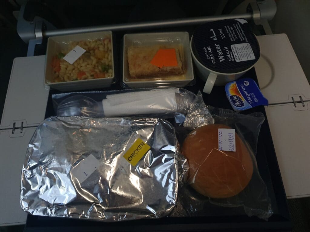 However, once the trolleys were rolled to the front of the cabin, for the purpose of the report, I decided to opt for the flight’s lunch service. As had been the case on the service from Frankfurt to Bahrain, the flight attendant manning the trolley took the time to explain both options to passengers. That lunchtime, these consisted of chicken curry with rice or a vegetable lasagne. Opting for the former, I was promptly handed a tray containing the main dish (chicken curry with white rice and a small portion of vegetable curry), a grain salad, a cake with a small portion of custard, a packaged bread roll complete with a cheese triangle and tub of margarine, water and a sachet containing plastic Gulf Air branded cutlery. Whilst I was barely able to touch the tray of food, I had a bite of the chicken which seemed to be of fairly decent quality. Meanwhile, this was followed by a round of drinks during which I opted for a tea.