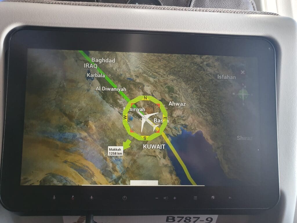 From Bahrain, the aircraft journeyed northwest over the Persian Gulf towards Kuwait and upon levelling off at its initial cruising altitude of 38,000 feet at 1120, trolleys were rolled out and the first drinks round commenced. Making quick progress, within a few minutes one of the flight attendants asked for my choice of drink and I opted for an orange juice which was handed to me in a Gulf Air branded plastic cup alongside a small bag of Gulf Air crackers, which in my opinion tasted rather similar to Mini Cheddars. Turning to the outside world, during the first hour or so of the flight occasional gaps in the clouds revealed the Persian Gulf before the aircraft made landfall over Kuwait’s Bubiyan Island, making a very quick crossing of the country before entering Iraqi airspace to the south of Basra. Once over Iraq, the sandy landscapes of the country’s Dhi Qar Governorate could be seen as the aircraft began its crossing of the country, trundling towards the capital and then onwards towards Kurdistan.