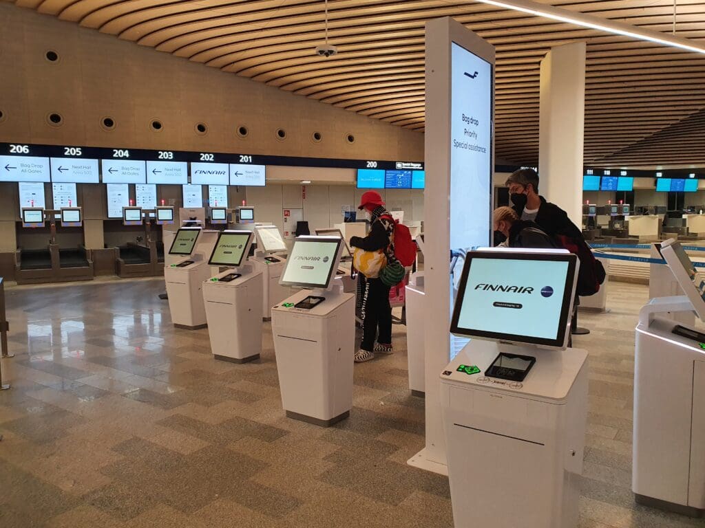 Upon heading up the first set of escalators, those heading to Terminal 1 are signposted right, and those to Terminal 2 are signposted left. Seeing as Finnair utilises Terminal 2 in Helsinki, I headed in the latter direction. However, admittedly this is slightly misleading as the airside portions of the airport’s two terminals are conjoined with nothing, as far as I am aware, that implies them to be two different terminals. Taking the lift, I soon arrived in the small and busy landside arrivals hall of the terminal before I continued upwards and arrived in Finnair’s main check-in hall. Located in a newly renovated part of the terminal that opened up in November 2021, I found this to be modern, spacious and airy although I did not spend a particularly long time there that morning. Once in this hall, I made my way over to a baggage tag printing machine, printed one of these off and attached it to my bag without any issue before following signs for the automated baggage drop-off desks which led me to Terminal 2’s unrenovated check-in hall and the security entrance.