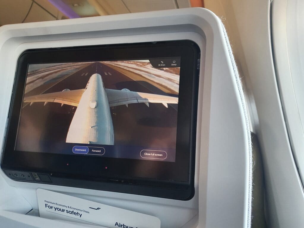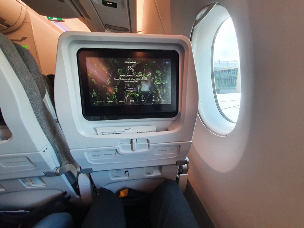 Not having to stop too often to make way for passengers, I managed to make it to the Economy section of the aircraft within a minute or so. In this, all Zodiac Z300 seats are covered in a very smart and clean-looking light grey fabric, and as one would hope for on a long haul aircraft these all feature an adjustable headrest, covered by a disposable fabric antimacassar featuring Finnair’s motif tucked away in one corner of this. On the rear of each Economy seat, the most notable feature is arguably the large and high-quality 12 inch wide inflight entertainment screens, with these powered by the popular Panasonic eX3 inflight entertainment system. Meanwhile, these also feature a seatback pocket and a literature compartment which on my flight contained a safety card and a sickbag.