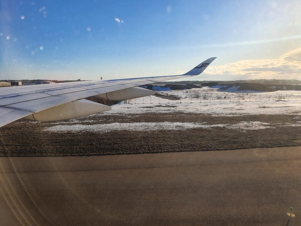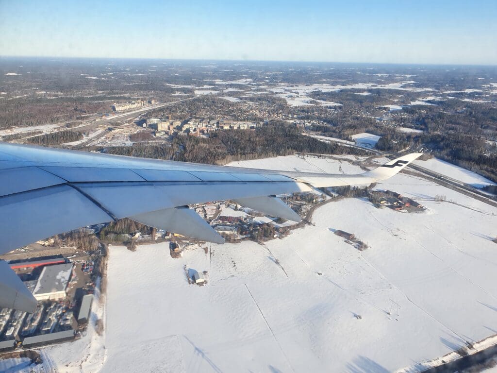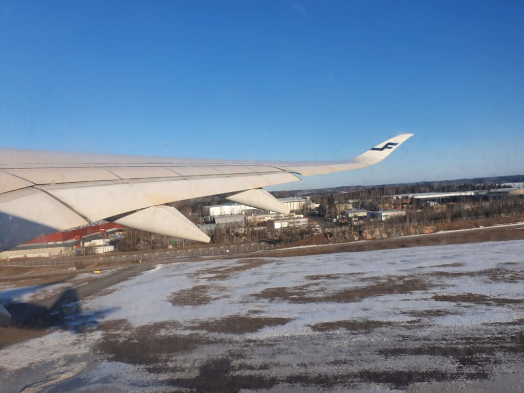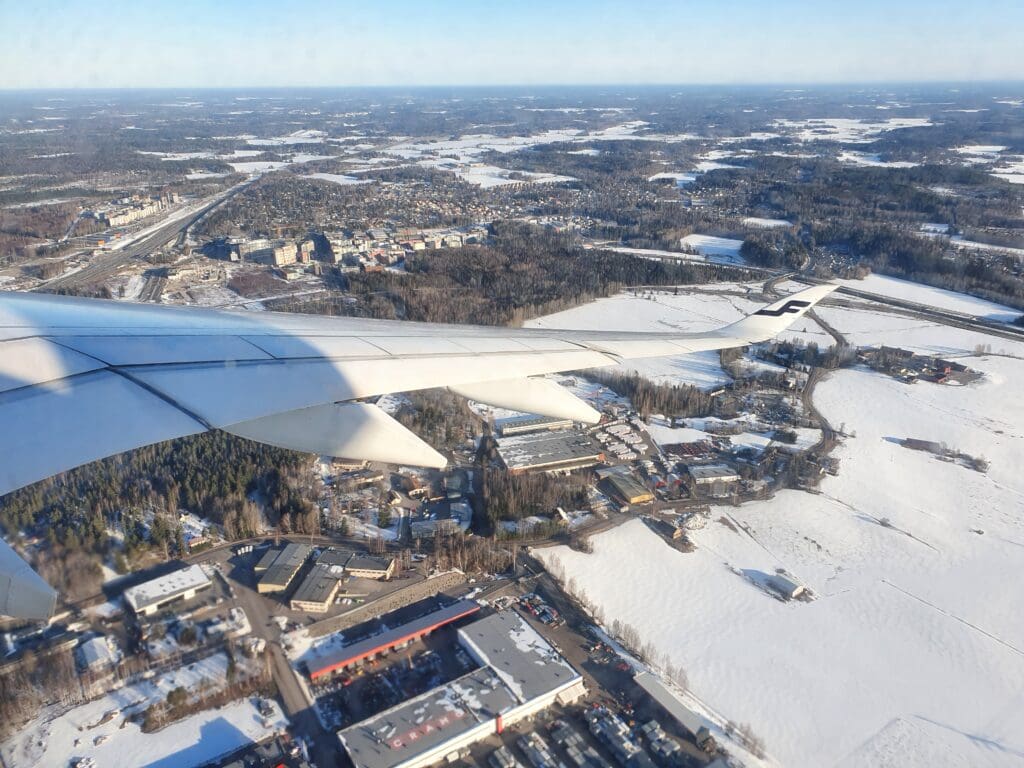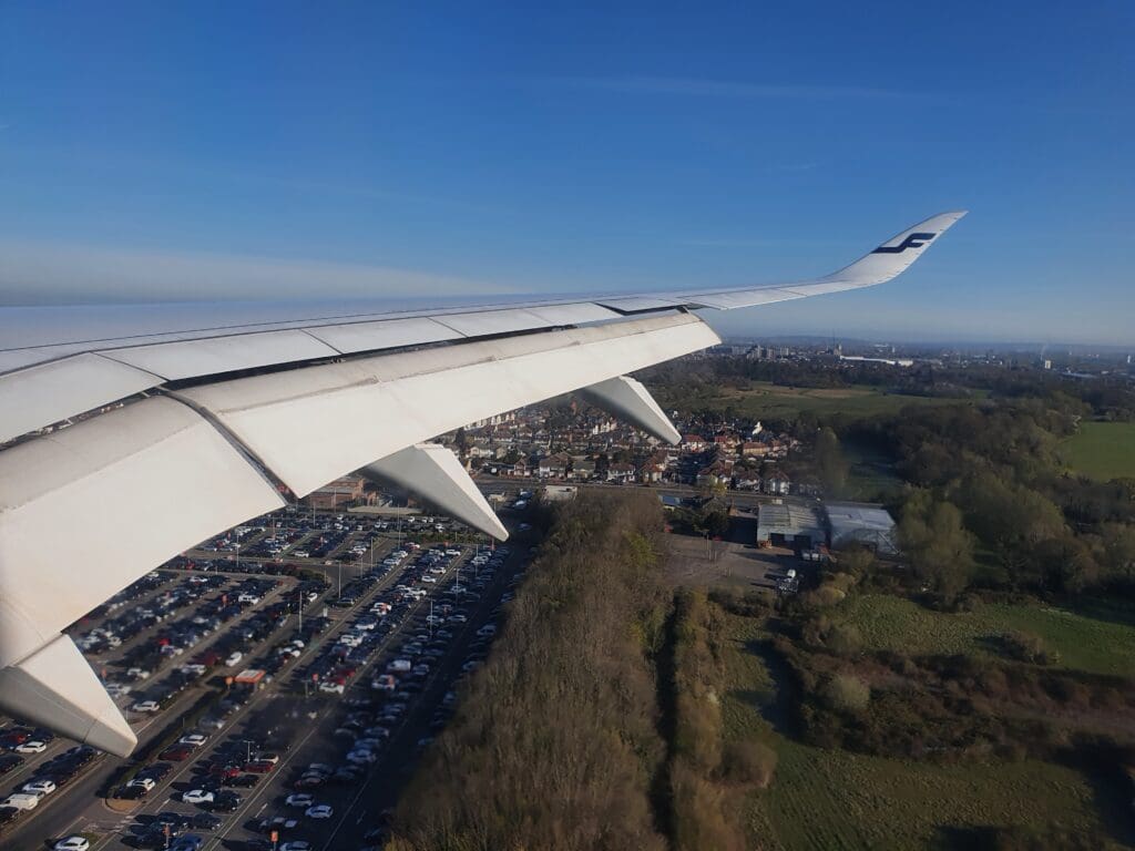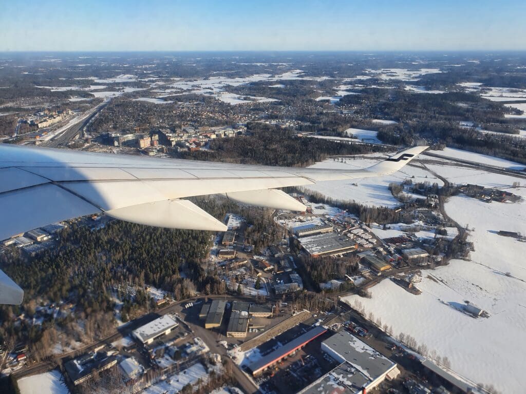 Wasting no time, once the de-icing process had been completed and the vehicles manoeuvred back into their starting position ready to welcome the next jet, the Airbus taxied forwards before turning left and making its way onto Runway 22R. Once on the runway, the two Rolls-Royce engines spooled up and the Airbus commenced what seemed to be a fairly gentle take-off, soon sunny skies of Finland. During the first minute or so of the flight, the industrial areas to the north of the airport could be seen before the aircraft banked right and then left, rolling out on a slight southwesterly course of about 258 degrees.
