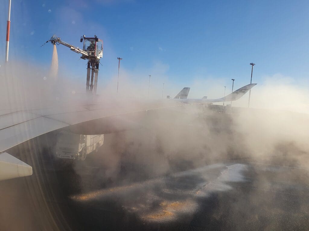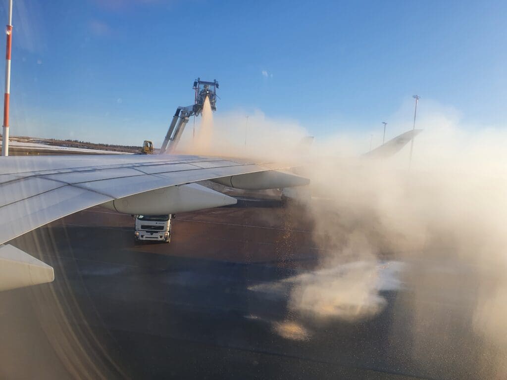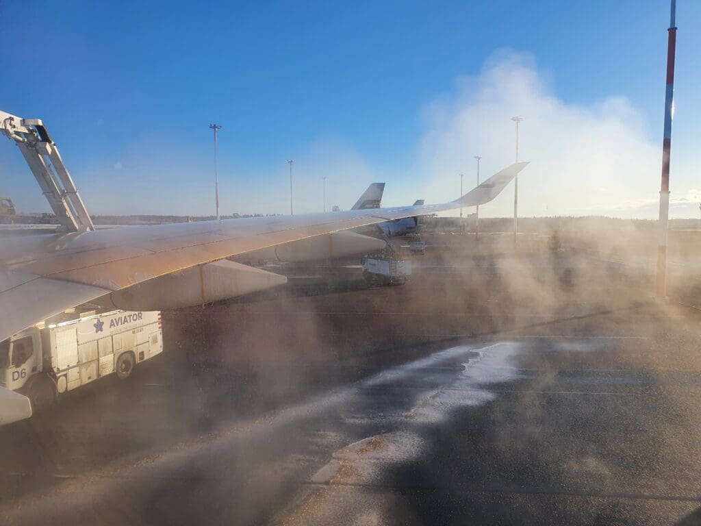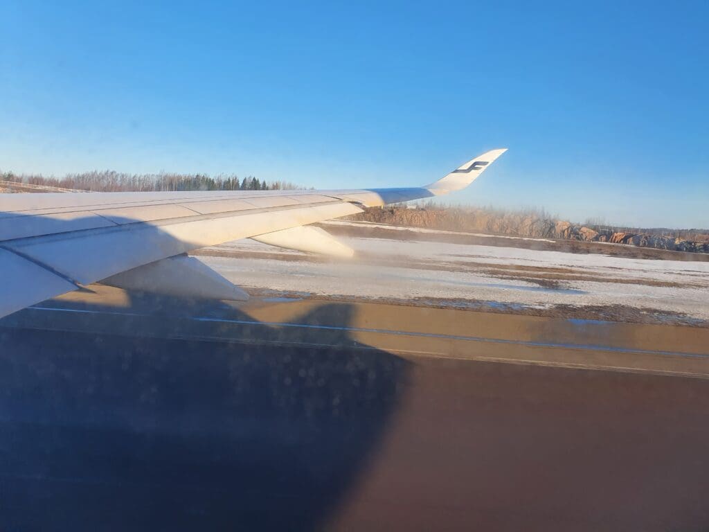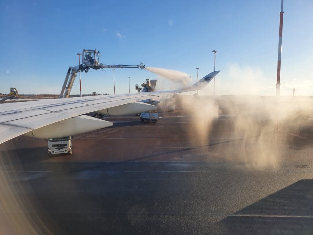 After coming to a halt, it was not too long before the tug was disconnected and the aircraft taxied off under its own power, with the right-hand engine making a smoky start-up during this. With the Airbus A350’s sleep wings twinkling thanks to a layer of ice that had formed since its arrival from Singapore earlier that morning, it did not come as much of a surprise to find that the aircraft would need to be de-iced before its departure. Heading off amid the early morning rush, as the aircraft pulled into one of the de-icing bays, two Italy-bound Airbus narrowbodies could be seen being sprayed down – one bound for Milan and the other for Rome. However, as one would hope given the Finnish winters, Helsinki Airport is well prepared for cold weather operations and several aircraft can be de-iced simultaneously. Thus, as soon as the aircraft came to a halt, a fleet of Star Wars-like vehicles manoeuvred into position around the jet and commenced their well-versed routine. As orange fluid was sprayed onto the aircraft, I did notice that a slight scent of this filtered through into the cabin although this did go away once deicing had been completed.