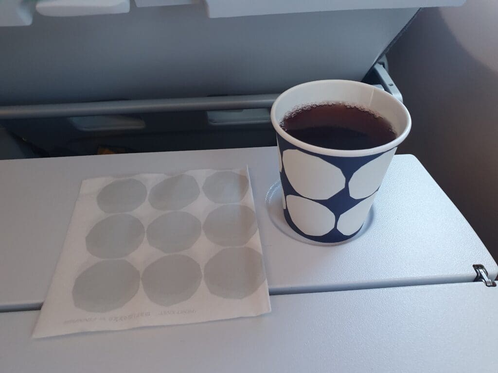 As the Airbus made its way out over the Baltic Sea, the next sight that could be seen was Åland, the autonomous group of islands that are a region of Finland and sit in the Baltic between Finland and Sweden. Down below, the islands’ small capital, Mariehamn could be seen passing as could its airport which is connected to both Stockholm and Turku by a regular Saab 340 operated service. Turning my attention to the happenings inside the cabin, at this time, the crew rolled out trolleys to the front of the cabin and commenced the onboard service. On their services to Europe and the Middle East, Finnair’s complimentary offering consists of nothing more than a cup of still water or blueberry juice. Meanwhile, a range of other drinks, chocolate, instant noodles, crisps and blueberry muffins can be purchased onboard, whilst their more comprehensive menu of sandwiches can only be pre-reserved before departure. Whilst it would have been nice to have been offered a little more, perhaps a cereal bar or similar, or have had the option to choose a coffee or tea, given the length of the flight, I couldn’t complain. However, were I to have been on one of Finnair’s services to say Gran Canaria or Dubai, I may have been left a little dissatisfied with the lack of options. Once the crew reached my row, I was served by a very friendly flight attendant and opted for a blueberry juice which was passed to be in a paper cup along with a serviette – both of which were adorned in a Marimekko pattern.