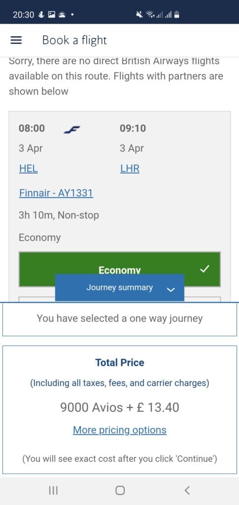 Needing to be back home in West London by the early afternoon, I was left with the Airbus A350 option which would depart Helsinki at 0800 and arrive in London three hours and ten minutes later at 0910. Examining Skyscanner, the cheapest possible ticket for the flight would set me back a reasonable £50. However, willing to part with some Avios, I logged in to my British Airways Executive Club account and soon discovered that there was reward flight availability on this service. This would cost 9000 Avios plus £13.40 in fees. With little hesitation, I decided to go for this and passed on the other options that would allow me to part with fewer Avios in exchange for a higher fee. From there, I was then presented with the option of donating to British Airways’ Changing Lives: One Child at a Time programme and Pure the Clean Planet Trust. Once I had agreed to the terms and conditions, I confirmed my details and was taken to the payment page where I entered all my payment information and received confirmation of my booking several minutes later. This revealed that I had been automatically assigned seat 29A for the flight to London.