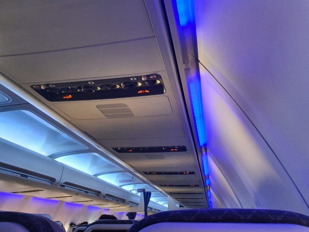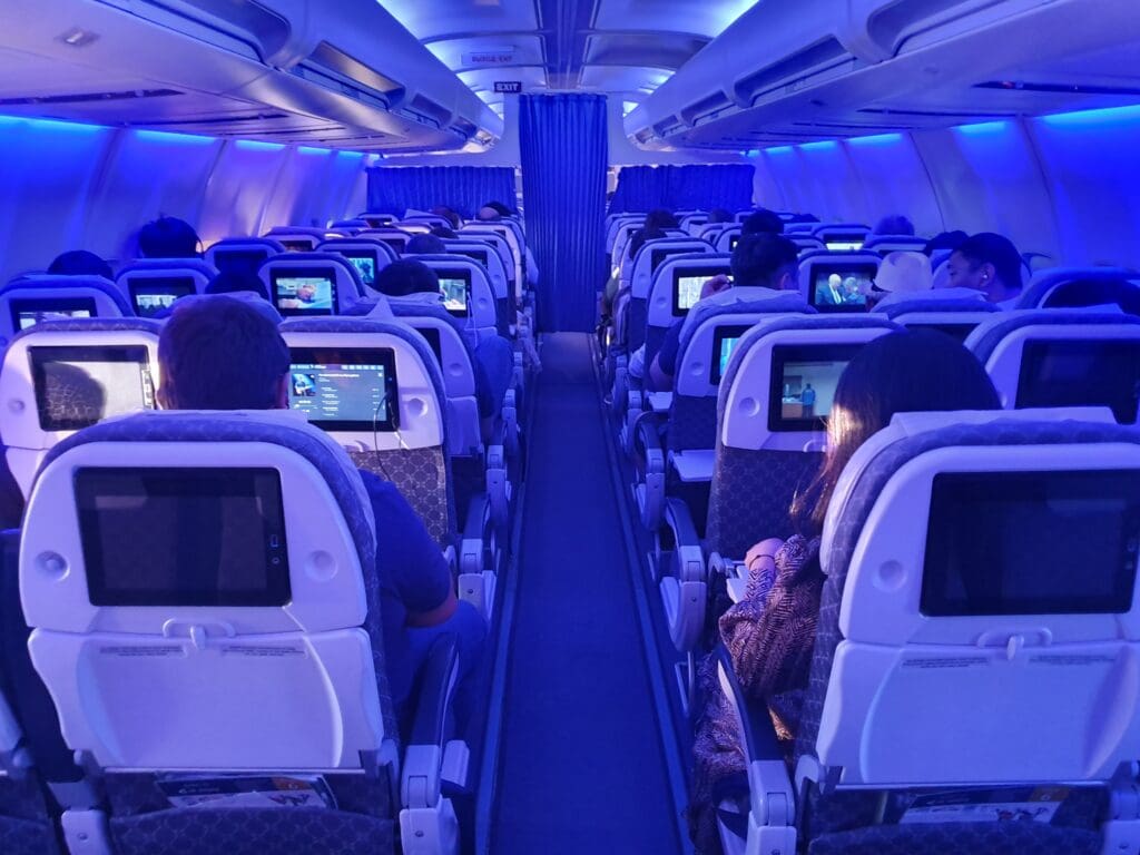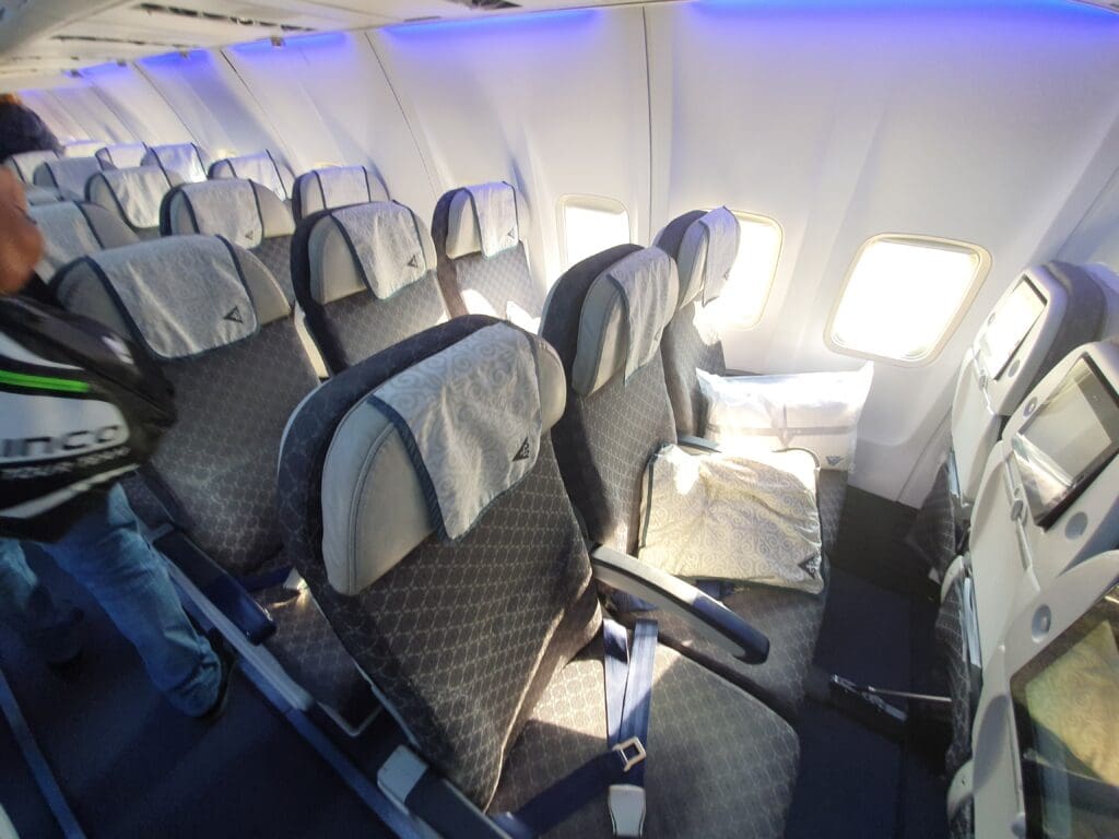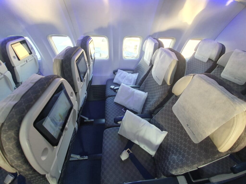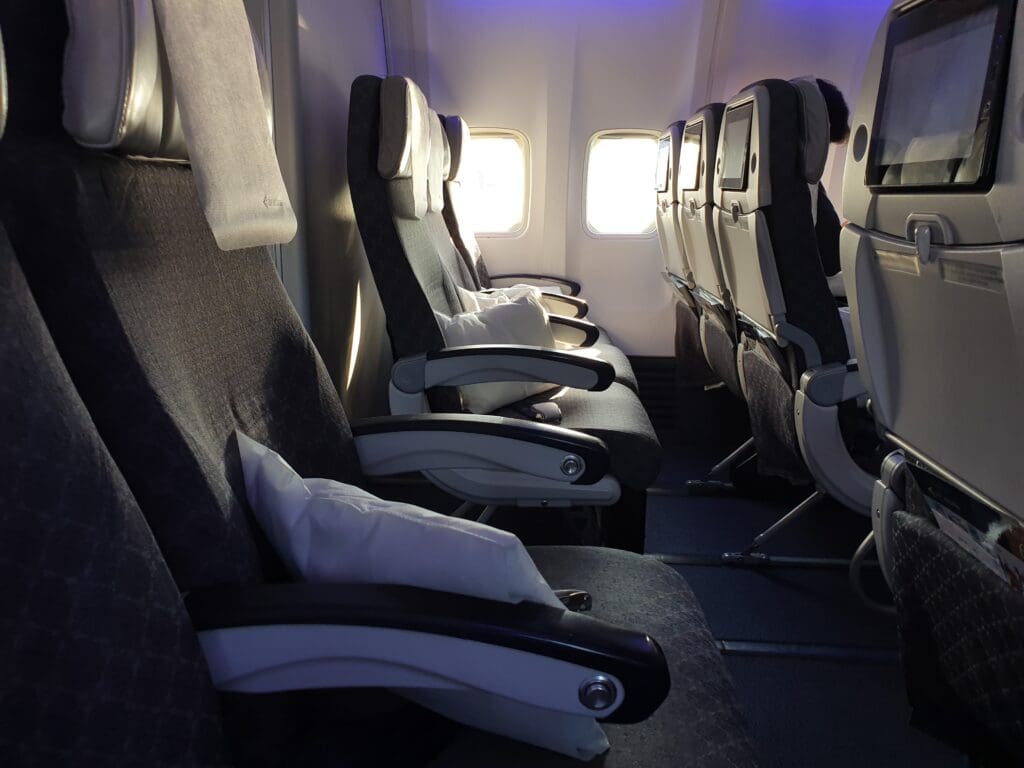 After passing through the cabin divider, I reached the small Economy Sleeper cabin in the middle of the aircraft. This product is Air Astana’s answer to premium economy, however, rather than offering a different seat or a more generous amount of legroom, the airline guarantees two empty seats next to the passenger which the crew transform into a bed once in the air. However, at the time of writing this service was only offered on Air Astana’s flights to Frankfurt, London and Paris, with this middle cabin serving as Economy on the rest of their services. Without any major delay, I arrived in the third portion of the aircraft and made my way to the rear of this, soon arriving at Row 39.