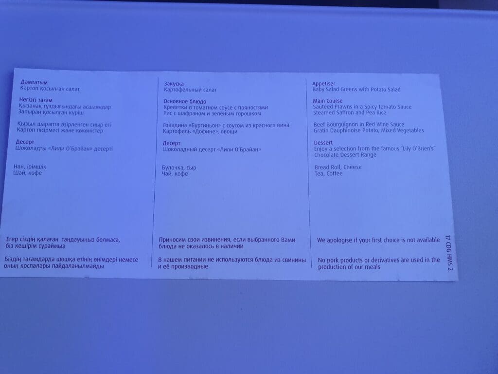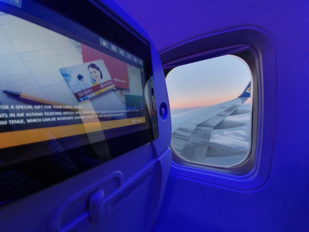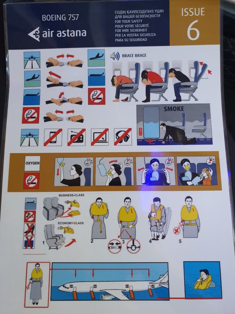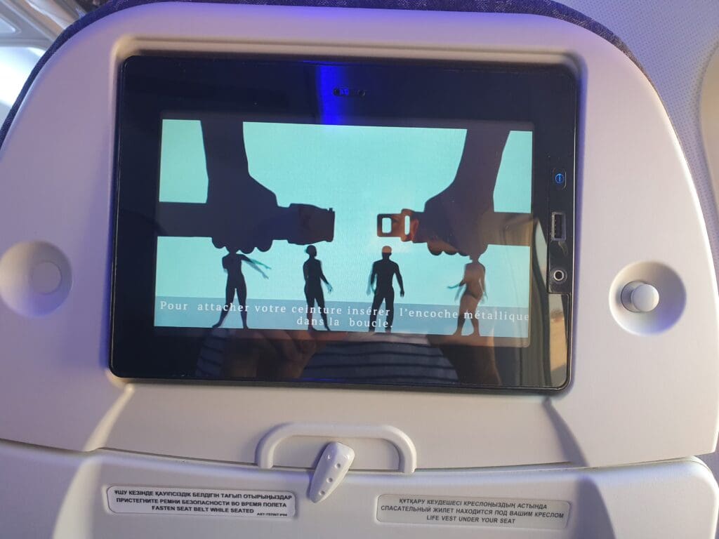 Around ten minutes after boarding had come to an end, at 1920 the Captain’s voice filled the cabin as they welcomed all passengers onboard – first in Russian and then again in English. During this opening speech, the Captain thanked passengers for flying with Air Astana, informed us all of the comparatively short 5H15 flight time and provided the next day’s weather forecast for Astana. This was followed by an announcement from the Purser in Kazakh, Russian and English with the usual welcomes, thanks and warnings. Once this had come to an end, Air Astana’s rather unique safety video was broadcast over the inflight entertainment screens. Introduced in 2017, this enlists the help of a troupe of ballet dancers (although only their silouettes can be seen) to detail the safety instructions. As was to be expected, this was played a total of three times – once in Kazakh with French subtitles, followed by Russian and English.