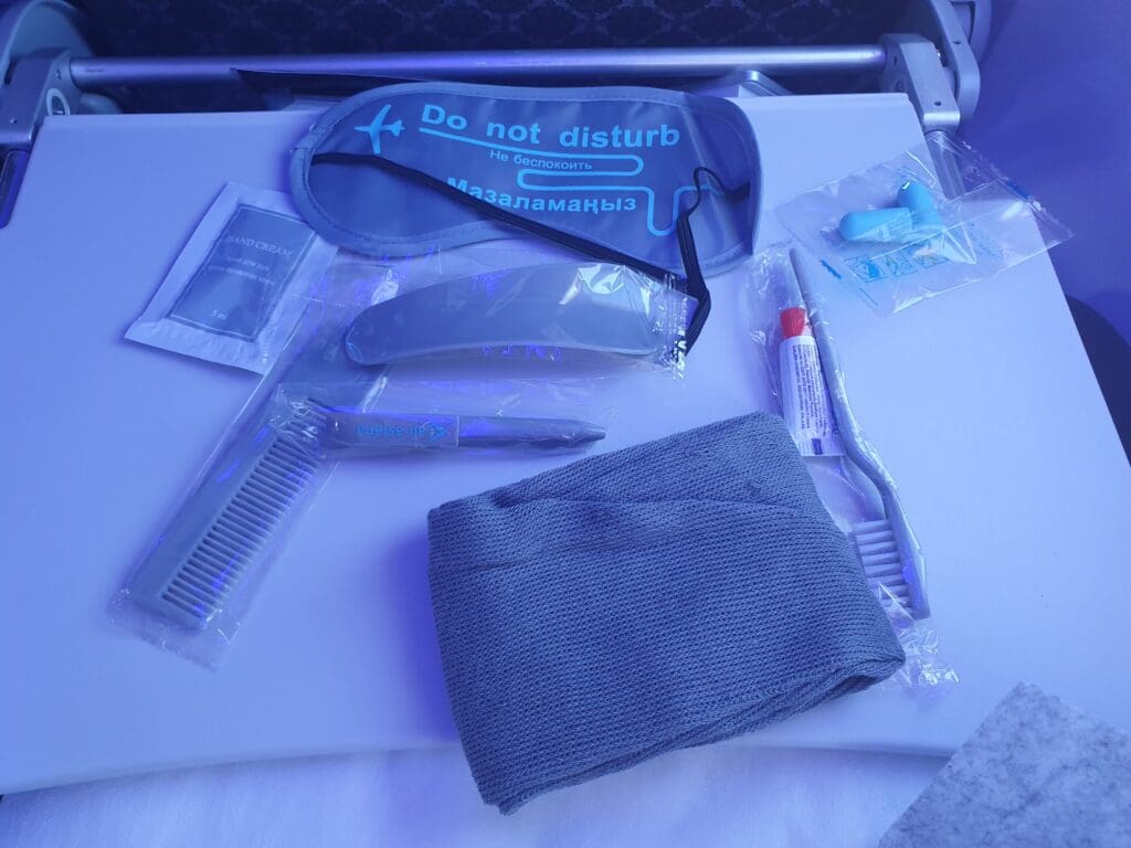 Despite the late commencement of boarding, thanks to a very light load with Economy appearing to be no more than 40% full, by 1910, all passengers had taken there seats. Looking around, there appeared to be very few passengers who did not hail from Kazakhstan – with the small number of passengers not from Kazakhstan hailing from China, Korea, the USA, and of course myself from the UK. Whilst the inflight entertainment system could be used from boarding until disembarkation, deciding to save this until we were up in the skies, as we waited to pushback I enjoyed the traditional Kazakh music that filled the cabin and watched the happenings outside as the last of the cargo was fed into the hold below. As we waited, the crew came around with boiled sweets, followed by packaged headphones and finally amenity kits – something that has unfortunately become a rarity on many airlines today or when provided, the contents scaled back to the very basics. Air Astana however is the exception, with this containing an impressive selection of socks, hand cream, a toothbrush and toothpaste, a comb, an eyemask, a shoe horn and a pen. Given the relatively short nature of the flight to Astana, this was a surprising and very welcome addition, furthering my very positive first impression of Kazakhstan’s national airline.