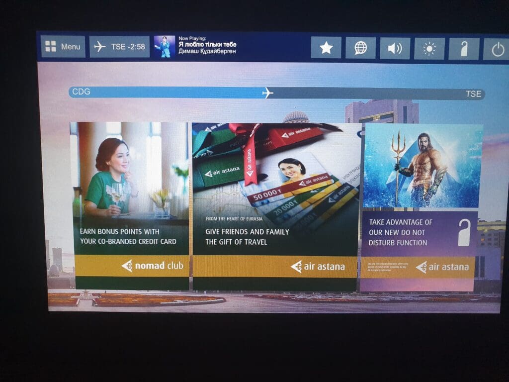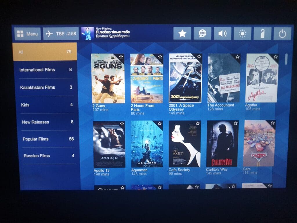 With little to see outside, I turned my attention to Air Astana’s inflight entertainment system. Named KCTV, I couldn’t help but notice that this shares a name with North Korea’s state-owned television channel, Korean Central Television! However, rather than being named in homage to this, this is the partnering of Air Astana’s IATA code ‘KC’ and television. Starting with the basics, I found the system to be easy to navigate, quick to load and respond to touch and home to a very decent selection of items. Specifically, this featured 79 films which ranged from the latest Hollywood releases to Soviet-era romantic comedies, alongside 65 television programmes and 250 audio albums. In addition to this, four programmes that were part of a series entitled ‘Discovering Kazakhstan’, seven interesting featurettes regarding the inner workings of Air Astana, titled ‘Inside Air Astana’ category, five games, a kids zone and a survey could be found. Last but not least, a scrolling moving map could be found for those wanting to follow the flight as we trundled eastwards towards Kazakhstan. Overall, I found the system to be well laid out and the touch screen highly responsive. My only complaint was that despite Air Astana’s fairly extensive route network, the system was available in just Kazakh, Russian and English only. Finally each visual item commenced with a series of advertisements for Lexus, Nazarbayev University, Cartier and Hyundai.