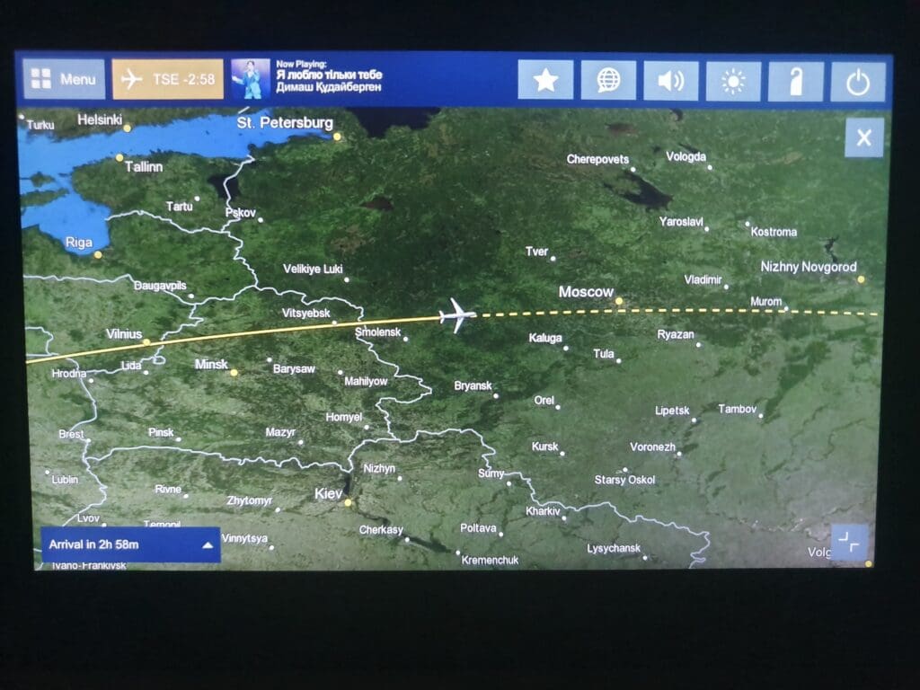 After a short twenty minute crossing of the northern portion of Belarus, the Boeing crossed into Russian airspace, passing to the north of Bryansk and Smolensk before reaching Moscow’s southern suburbs. Once south of Moscow, occasional bright flashes every fifteen seconds or so were visible, lighting up the sky towards Ryazan. With little to do, I decided to take a short thirty minute nap, waking up somewhere near Kazan with around two hours of flight time remaining. Having woken up incredibly thirsty, I decided to head to the rear galley and ask for a tea. However, seeing the curtain closed, for the first time in my life I decided to press the call button, feeling somewhat guilty after doing so as this illuminated the rows in front and behind of mine which were filled by slumbering passengers. Thankfully, this was soon answered and within no more than two minutes, the flight attendant returned with a boiling hot tea. As I carefully sipped this, our aircraft entered Kazakhstani airspace near Kostanay, a city that our aircraft had visited the previous day.
