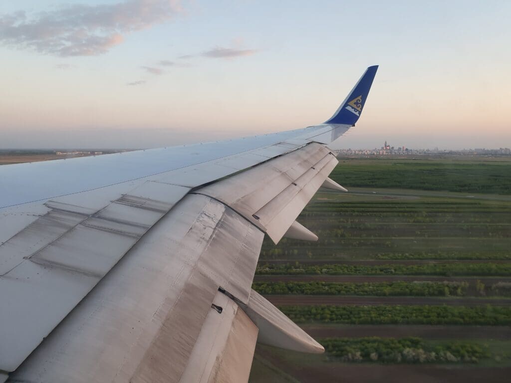 Eventually, at 0510, Kazakhstan’s capital city could be seen suddenly rising out of the countryside and our flaps began to be extended in stages whilst inside the cabin music rang out and would continue to do so until disembarkation. After flying past the city, our aircraft looped around the capital before setting itself up for an approach on Runway 22, an arrival that allows those on the right hand side of the aircraft superb views of the city.