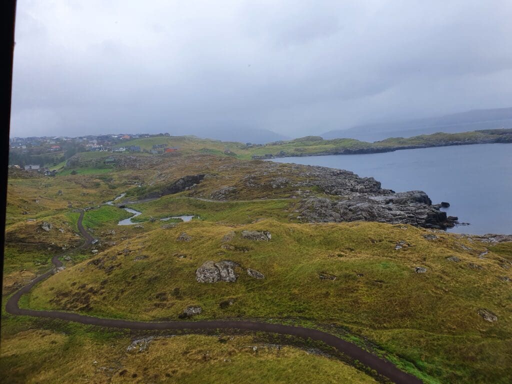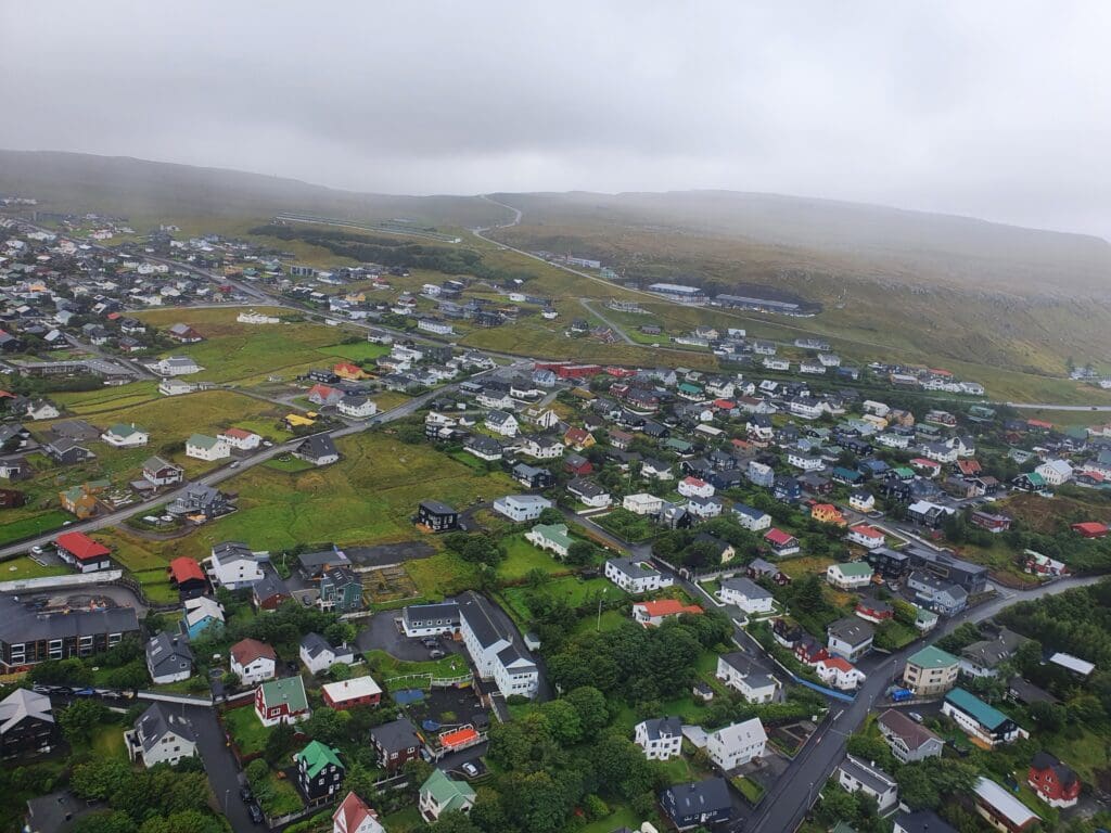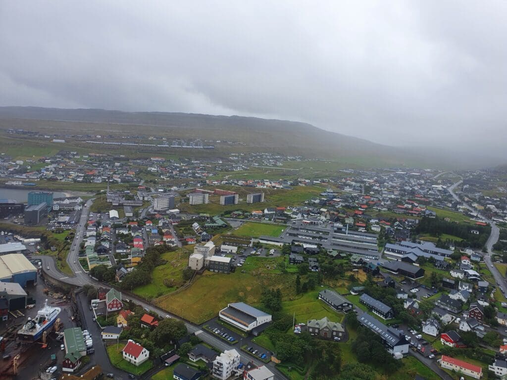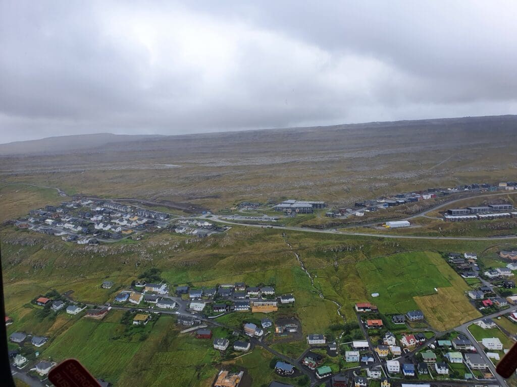 Outside, once all bags had been loaded into the hold at the rear of the aircraft, the door slid shut and the helicopter soon journeyed upwards into the cloudy skies. After leaving the helipad, the helicopter flew along Tórshavn’s coastline before crossing over its harbour and heading inland. Whilst those on the opposite side of the helicopter received views of the city’s historic sights such as Skansin fortress, the old cathedral and the quaint red wooden parliament buildings, sitting on the right I was treated to views of the docks, the city’s hospital and the football stadium, Tórsvøllur.