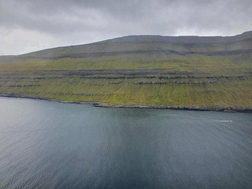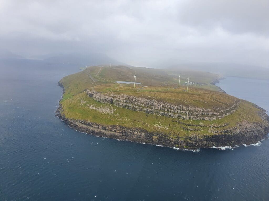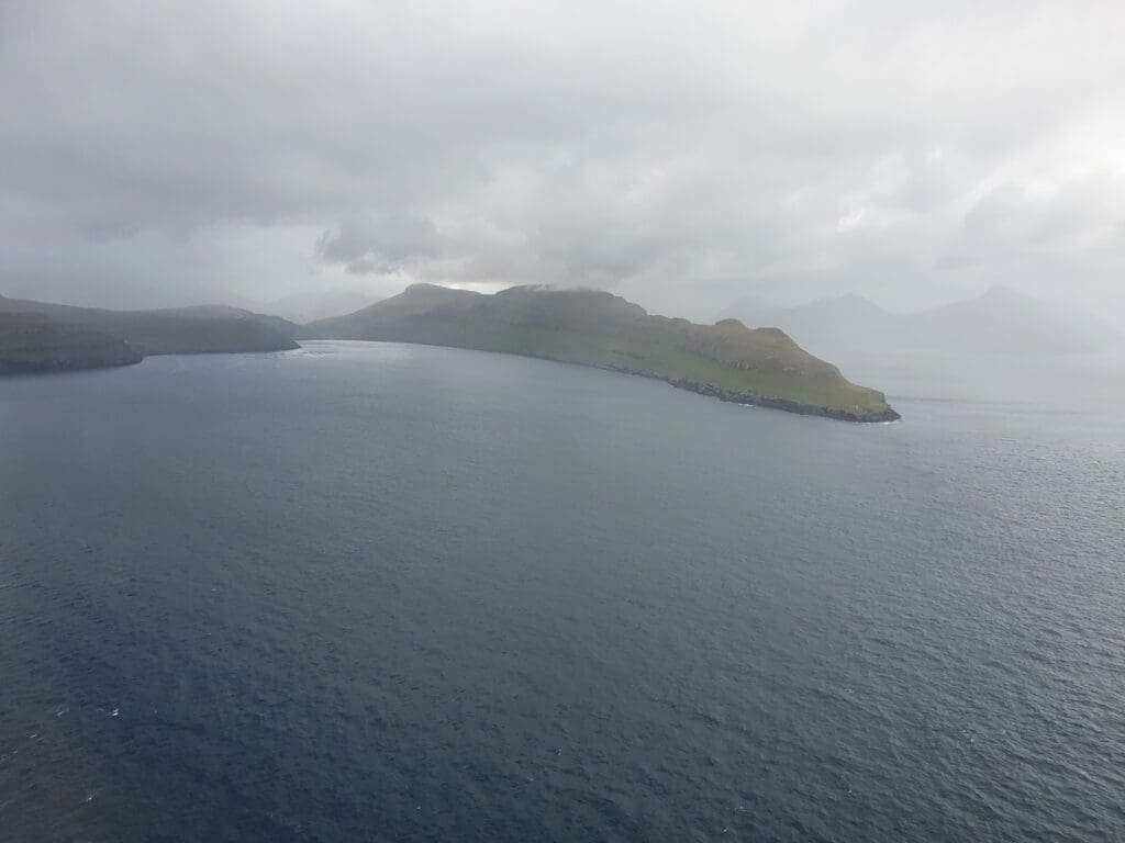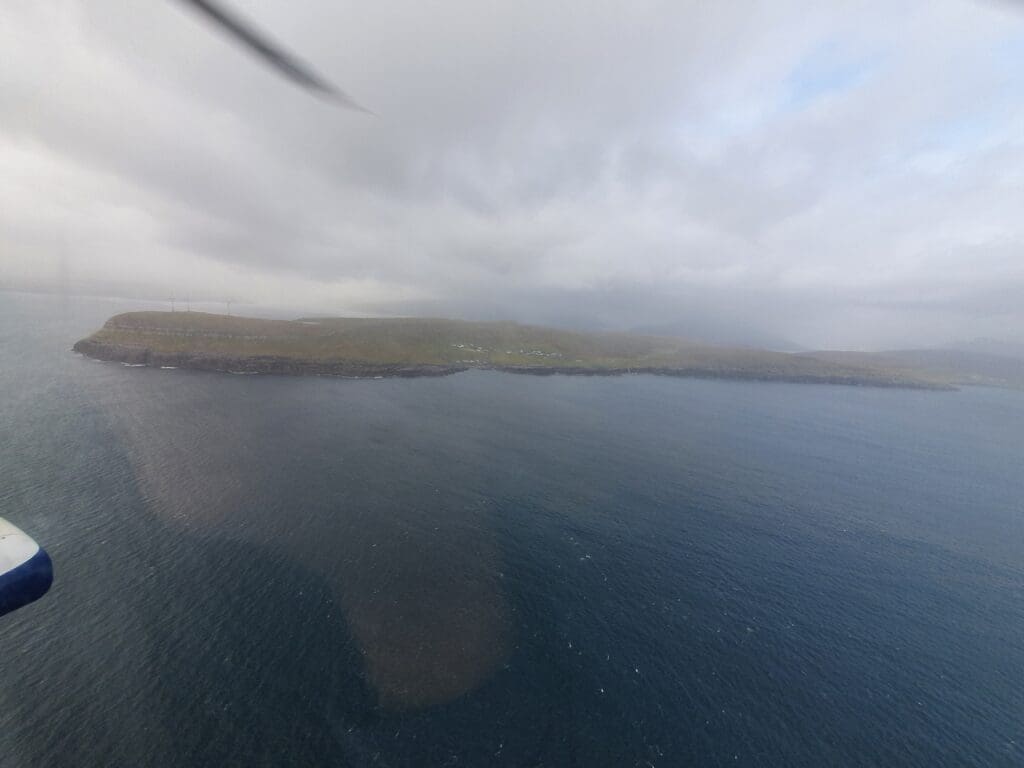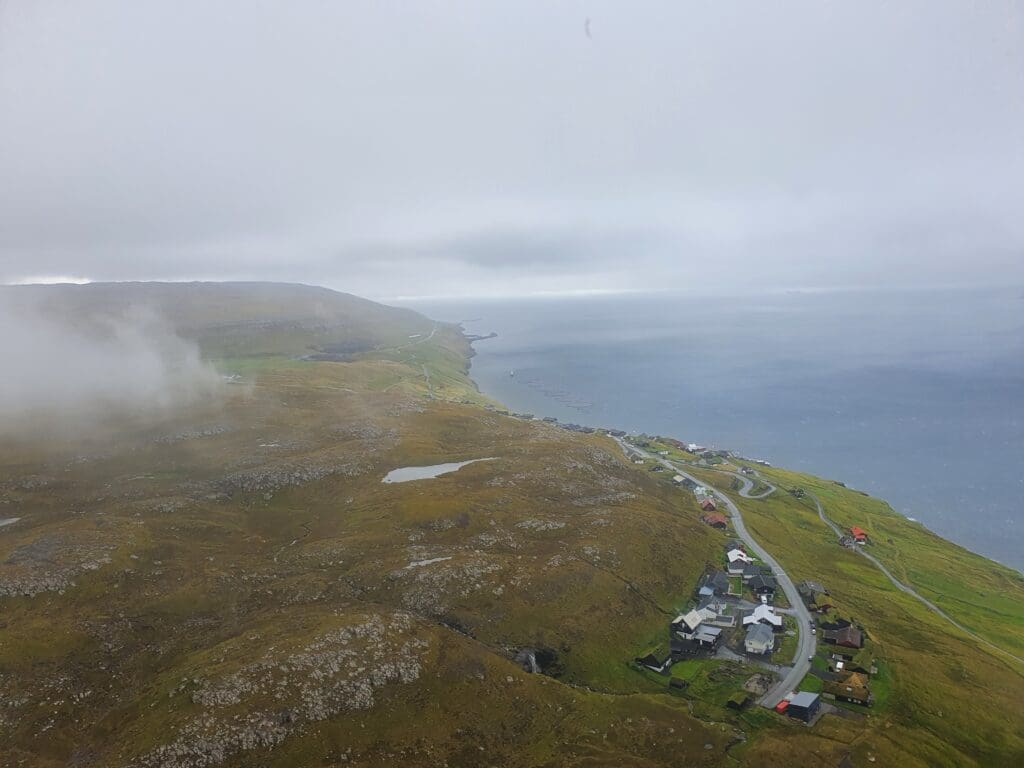 After leaving Tórshvan behind, the helicopter made its way towards the coast and after passing the village of Hoyvík, the aircraft headed out to sea. As the aircraft left the island of Streymoy behind, the southern tip of the island of Eysturoy and its cluster of wind turbines could be seen as the helicopter journeyed up the island’s western coastline. At this point, the pilot’s voice filled the cabin once more as they announced that after Klaksvik, the aircraft would journey onwards to Svinoy and Kirkja. Reminding passengers of the peculiarities of Faroese helicopter operations, the captain mentioned that whilst they had been set to also head to Hattarvík, as a local farmer was harvesting and they had not heard yet whether they had finished, this would not be possible and thus those bound for Hattarvík would have to disembark in Kirkja and made the last part of the journey by road.