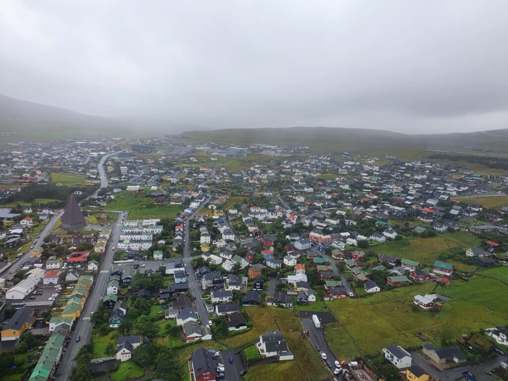 Despite our proximity to the Faroes’ capital, for a few moments, the only signs of life below took the form of clusters of sheep and the odd farmhouse poking out of the landscape here and there. However, not too long after, all of a sudden buildings rose out of the land below as we reached the outskirts of Tórshavn. As we passed over the city centre, the captain announced that we would be landing in a minute and the helicopter made its way out to sea before turning back towards the coastline and decelerating in preparation for our arrival.