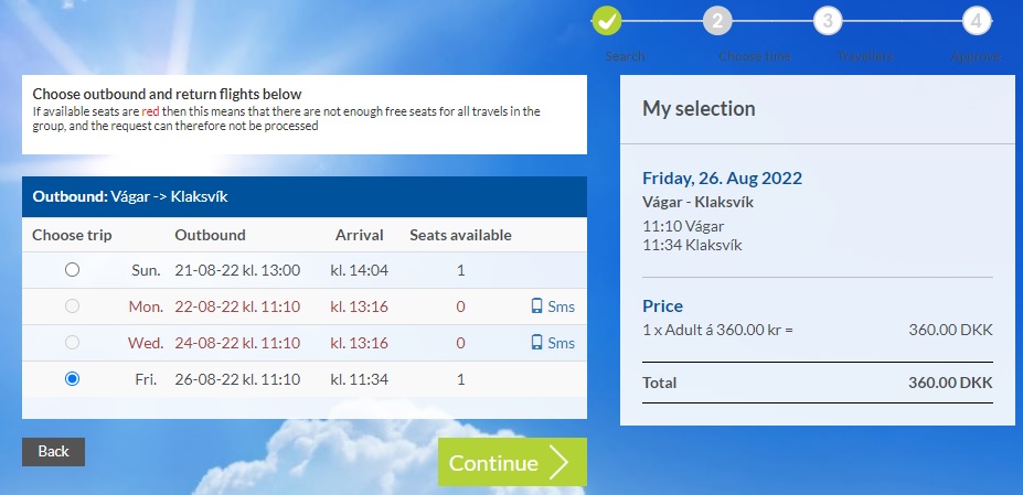 Whilst those who enjoy having firm plans may wish to have solidified their travel arrangements months in advance, this is simply not possible when it comes to Atlantic Airways scheduled helicopter services. Most of these can only be booked seven days prior to departure, with the exception of flights between Froðba and Skúvoy which can only be booked two days prior to departure. In order to avoid disappointment, especially during the peak summer season, it is advisable to book helicopter tickets as close to the booking window opening as possible. For most, the easiest way to book tickets is via the helicopter section of Atlantic Airways’ website – with this providing a range of useful information for those heading off on the carrier’s choppers, including a comprehensive table listing the carrier’s fixed-price fares which range between 85kr (£9.71) and 360kr (£41.14).