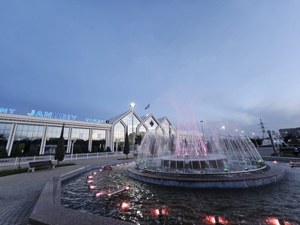 Being rush hour, we spent the entire journey to the station stopping and starting, often rather abruptly, causing no fewer than three fellow standing passengers to almost fall over as the bus crawled along the main road. Eventually, around thirty minutes after leaving the city centre, I disembarked and walked the last 300 metres or so on foot, passing over a busy main road before the welcome sight of Tashkent South Station appeared like a mirage in the desert. As with many major railway stations in Uzbekistan, this came in the form of a grand and well-polished building which combines elements of traditional Uzbek design with modern architecture. In front of this, a well-manicured garden could be found, complete with a colourful fountain providing passengers with a relaxing place to wait before heading to catch their train.