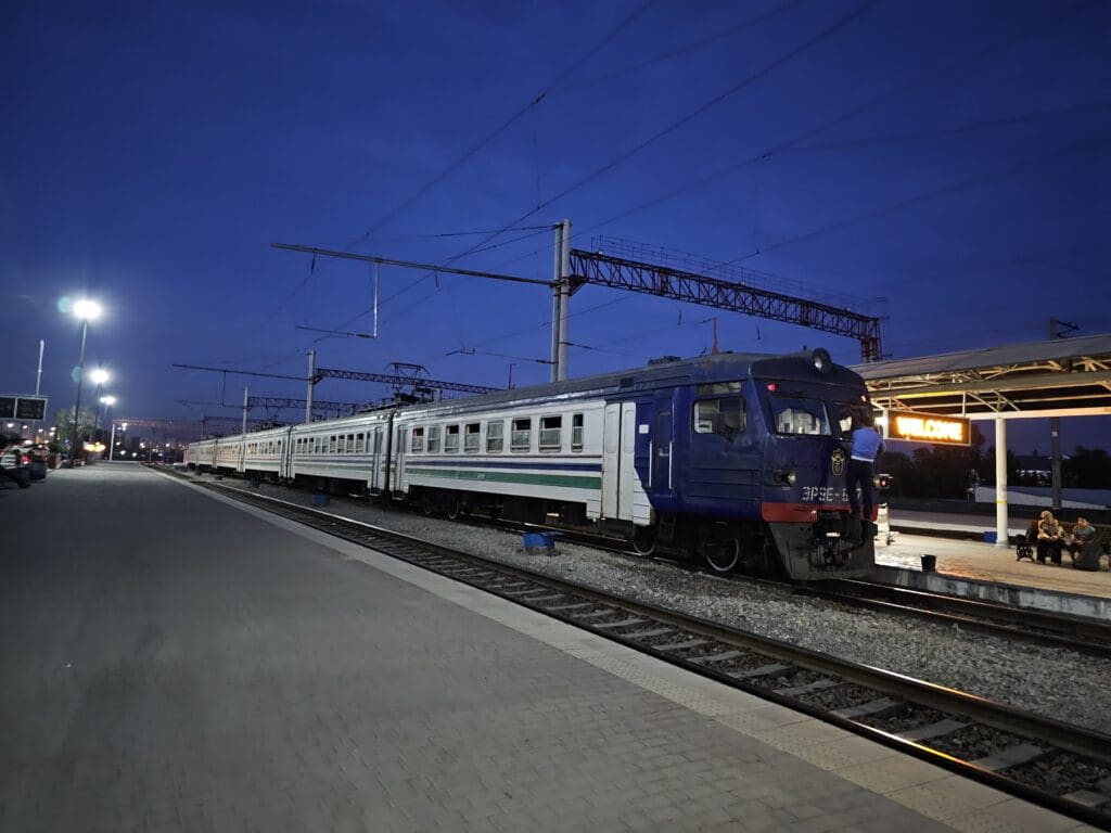 Whilst darkness had fallen, seeing as it was still relatively warm, I decided to get as much fresh air as possible before locking myself away in my cabin and thus headed outside to the platform. Far from being the world’s busiest station, at that time, just one train could be seen waiting across the tracks. This came in the form of an old and slightly rusty-looking ER9 electric multiple unit. Manufactured in Riga during the Soviet era, these trains remain commonplace on short commuter routes across the former Soviet Union.