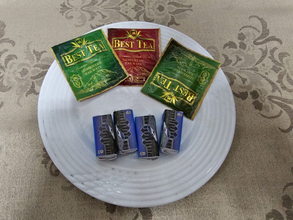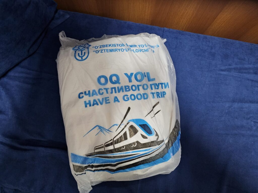 Upon entering through the sliding cabin door, in spite of its retro aesthetics, I found my cabin to be clean and tidy. This consisted of two firm beds on either side of this, separated by a small table jutting out from underneath the window – with this covered in a table cloth and featuring a paper plate on which snazzy Uzbekistan Railways branded teabags and sugar cubes had been placed. Meanwhile, bedding had been placed out on the bed ready to be made, and far from the likes of Emirates or Singapore Airlines, I am almost certain that the attendant would not have been best pleased to be called out to any of the cabins to make this up! For those with large bags and the muscles to lift them up, a storage area could be found just above the sliding cabin door. Finally, no working plug sockets could be found anywhere in the cabin or indeed the carriage and so I would advise those on longer journeys to bring battery packs with them.