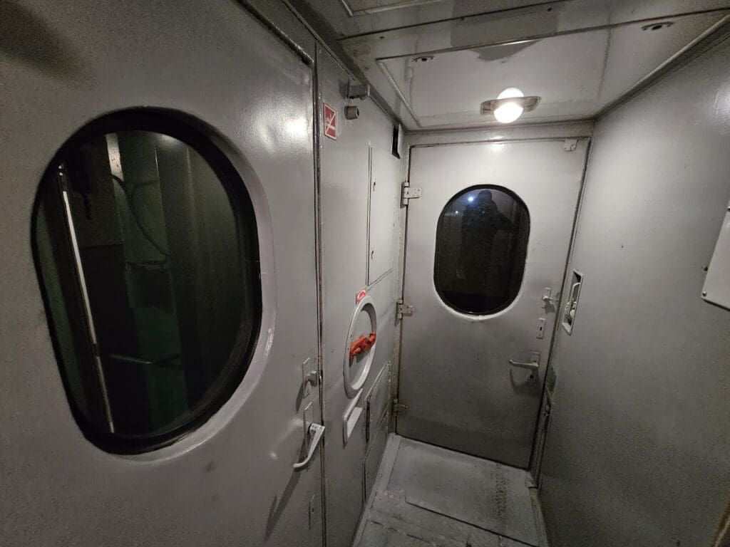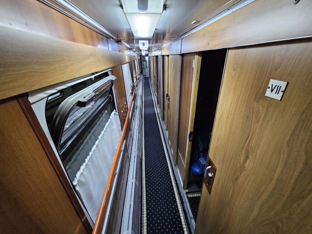 Ready and raring to embark on my Uzbek sleeper train experience, I soon headed down the platform and found my carriage. As I neared the door of this, a tough-looking yet friendly middle-aged railway worker smartly dressed in Uzbekistan Railways’ uniform greeted me in Russian, at which point I showed my ticket and passpor,t at which point they seemed to be rather surprised at both the fact that I had booked the entire two-berth cabin. Fortunately, not taking issue with this, I was soon allowed to climb up into the Soviet-era time capsule. With the exception of the non-functional television screens in each cabin, the carriage appeared to have undergone nothing other than minimal renovation during its long career on the rails. In fact, to a non-expert, there was probably little inside this that would have surprised a passenger in the seventies or eighties. Once out of the vestibule, I turned left and passed the samovar, as well as the attendant’s cabin and toilet – one of two in the carriage. I then headed down the narrow corridor that runs down the left-hand side of the carriage before arriving at my cabin, which was located roughly in the middle of this.