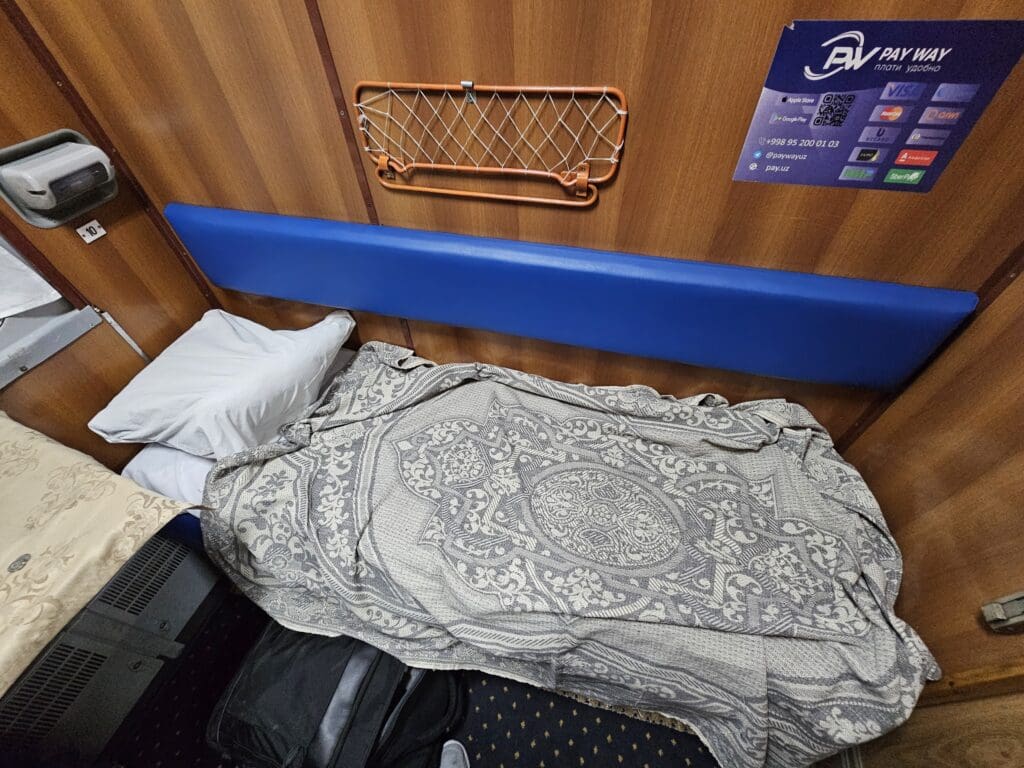 Once I had selected this, I was then presented with three accommodation options. Unlike sleeper trains in many other countries, those in Uzbekistan do not have a seated option, and instead, the cheapest tickets are for berths in the train’s ‘platzkart’ carriages. These are like dormitories, with plenty of bunks but no individual cabins and were priced at 120,940 S’om (£8.30/€9.61/$10.49). The next level up was a berth in a ‘cupe’ – with these being four-bed cabins, priced at 153,370 S’om (£10.53/€12.19/$13.31). Meanwhile, the most expensive tickets were those for berths in one of the ‘spalny’ wagons, which feature nine cabins with just two berths – with one berth in these costing 278,500 S’om (£19.12/€22.14/$24.16). Whilst some may laugh at my lack of a sense of adventure, not wanting to share, I ended up booking two berths in one of these cabins, making a quick and easy payment before receiving my e-ticket.