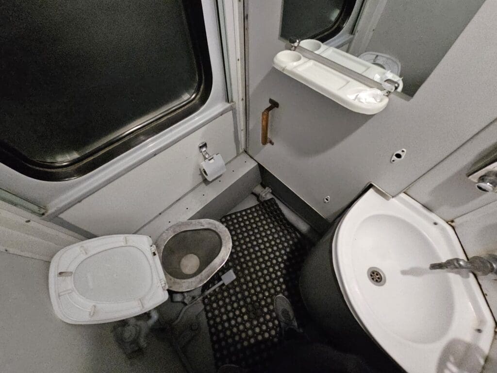 Keeping to schedule, at 2100, the train jolted forward as we began to rattle away from the platform, making a slow and rather rickety exit from Tashkent before picking up speed as we journeyed southwestwards out into the dark countryside. Several minutes into the journey, a vendor passed through the carriage with a bucket of ice containing a selection of alcoholic and non-alcoholic drinks as well as a plastic bag of various snacks. Passing on these, it wasn’t too long before my cabin door slid open, at which point the attendant appeared with another passenger in tow. As it happened, it seemed that the attendant had offered this passenger an unofficial upgrade, giving my second bed to another passenger! Bearing some resemblance to a film or drama where a new prisoner arrives in their cell and meets their cellmate for the first time, the guard then slammed the door shut. Given my poor Russian and non-existent Uzbek skills, as well as their lack of English, we exchanged few words and sat around awkwardly for a while before I decided to make a temporary escape in the form of a trip to the bathroom. Whilst relatively spacious, I have to say that this was far from the nicest train toilet that I have had the pleasure of visiting and did not seem to be in the best of states.