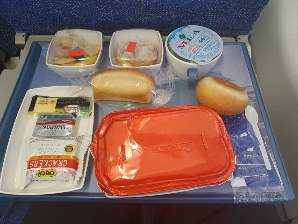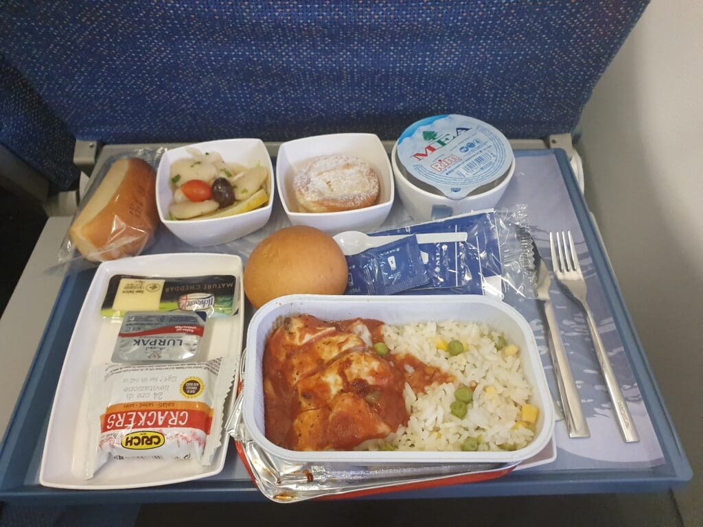 Around the midpoint of our crossing of Syria, the aircraft levelled off at 33,000 feet and a short time later two trolleys were rolled out to the front of the Economy cabin. Despite being an entirely full flight, the crew seemed to work rearwards at a respectable pace, although as I would soon discover this was largely down to the crew’s lack of dialogue and hasty handing out of meals. In the not too distant past, Middle East Airlines handed out paper menus detailing the meal choices onboard each flight, however, these have since been eliminated as part of cost saving measures. Whilst these would have been a nice touch, I was thankful for the fact that the hot meal had not been relegated to a snack box or similar given the length of the flight. Around ten minutes after the service commenced the first two crew members reached my row and I was abruptly asked ‘chicken or fish?’. Like my two seatmates, I opted for the chicken and was handed a blue plastic tray featuring a respectable selection of dishes. Aside from the main dish, this featured a seemingly fresh and healthy looking bean salad complete with several olives and a slice of lemon, no fewer than two bread rolls (one fresh and the other packaged), a pack of crackers, a chunk of British cheddar cheese, a small container of butter, an airline-style tub of Middle East Airlines branded water and last but not least, a small cake to end to the meal. In addition, real metal cutlery featuring the airline’s logo was provided which was a welcome if not expected touch.