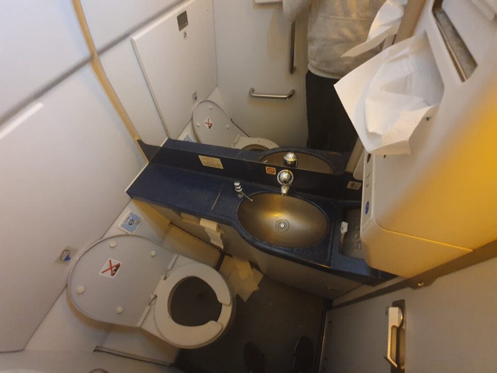 Seeing as there was not a great amount of time to go prior to the aircraft’s arrival, at this point in the flight I decided to head to one of the two lavatories at the rear of the aircraft. As it turned out, plenty of other people shared the same idea as me and so some waiting was in order before I was allowed to proceed into one of these. As one would expect, this was stocked with all the basics – soap, tissues and toilet roll, however, this did seem to be dirty and in poor condition.