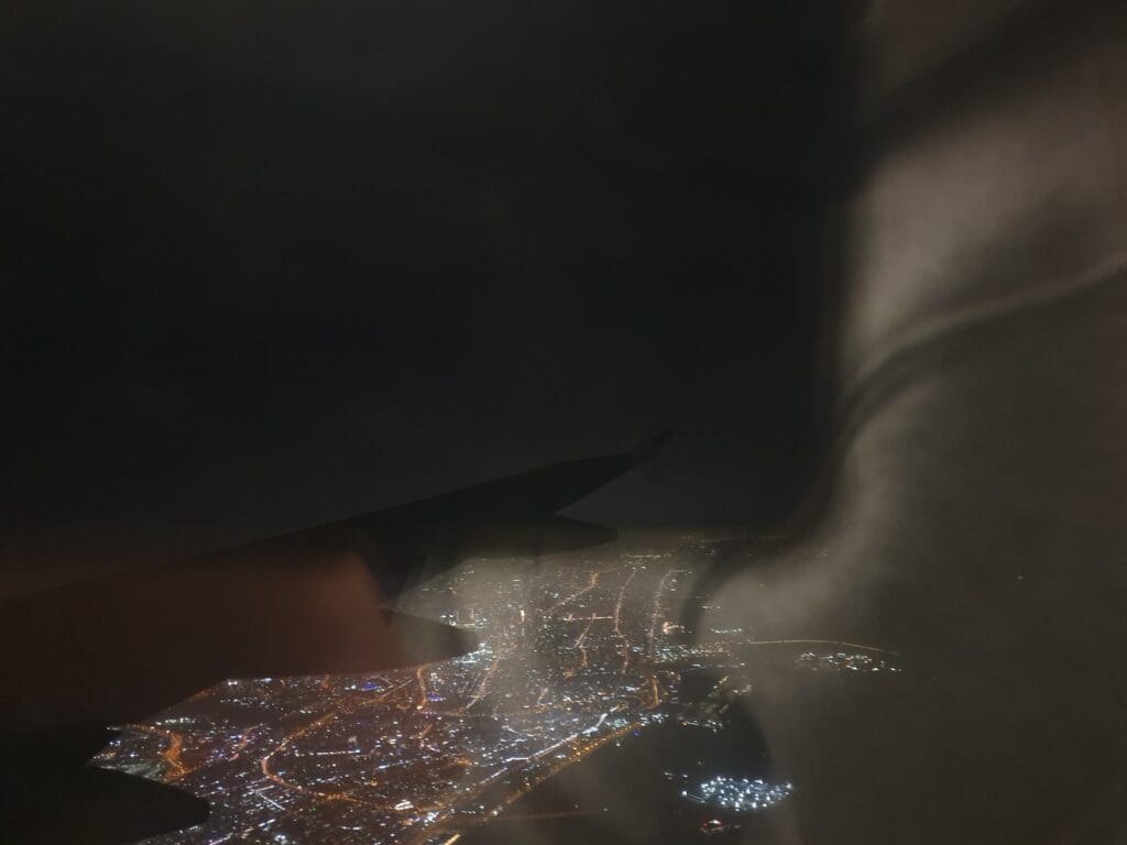 Returning to my seat less than impressed, by this time there were only 45 minutes to go until our arrival. With 40 minutes to go, our Airbus A320 could be felt gently commencing its descent towards the ground. Even though the aircraft could be felt sinking downwards, no announcement was made by any member of the cabin crew who could be heard chatting away rather loudly in the rear galley. Eventually, as the aircraft passed down through 16,000 feet, the cabin lights were switched on at full blast and the seat belt signs were reilluminated. Moments later two of the cabin crew members passed through the cabin ensuring all was in place for the aircraft’s arrival. Given the lack of any announcement regarding this, unsurprisingly they appeared to have their work cut out asking passengers to make the necessary adjustments in preparation for this. At 2105 Dubai’s shoreline came into view as we headed along the coast before descending through 10,000 feet. Having opted for a seat on the right-hand side of the aircraft in the hope that this would allow for some good night views of Dubai during the final stages of the flight, as we headed towards the coast I hoped that the lights inside the cabin would be dimmed. Unfortunately, this was not the case and thus peering out of the window, views of Dubai’s sights were limited and photographing them was all but impossible.