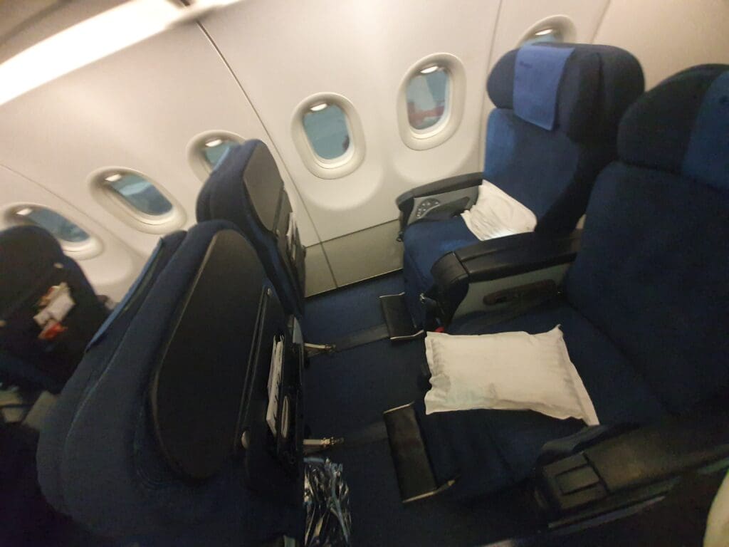 As I stepped off the jetway and into the forward galley, my flight with Middle East Airlines got off to a positive start as I immediately received a friendly welcome from the Purser in French and English. After showing my boarding pass I was advised to head to the middle of the Economy cabin and soon found myself in the relative luxury of the A320’s Cedar Class cabin. There, six rows of well-padded and classic looking recliner seats covered in blue fabric could be seen in a 2-2 configuration. Despite not being quite on the same level as a lie-flat seat, such seats appeared to be far superior to those on Europe’s major carriers. After a short wait for a passenger to stow their belongings, I entered the 102-seat Economy cabin which commences from the overwing exits, or Row 20 (technically Row 7). In this section, each fixed-shell seat was covered in a dark blue fabric with yellow and turquoise stitching and was complete with an adjustable headrest covered by either a light blue or sunrise orange fabric antimacassar. Each of these seats featured a dated-looking inflight entertainment screen and a chunky controller to the left of the screen. Giving an un-uniform look, upon boarding around half of these were switched on and displayed a welcome message whilst the others were switched off. As I made my way to Row 28, despite my initial warm welcome, I did not receive any sort of greeting from the two flight attendants that I passed further down the cabin.