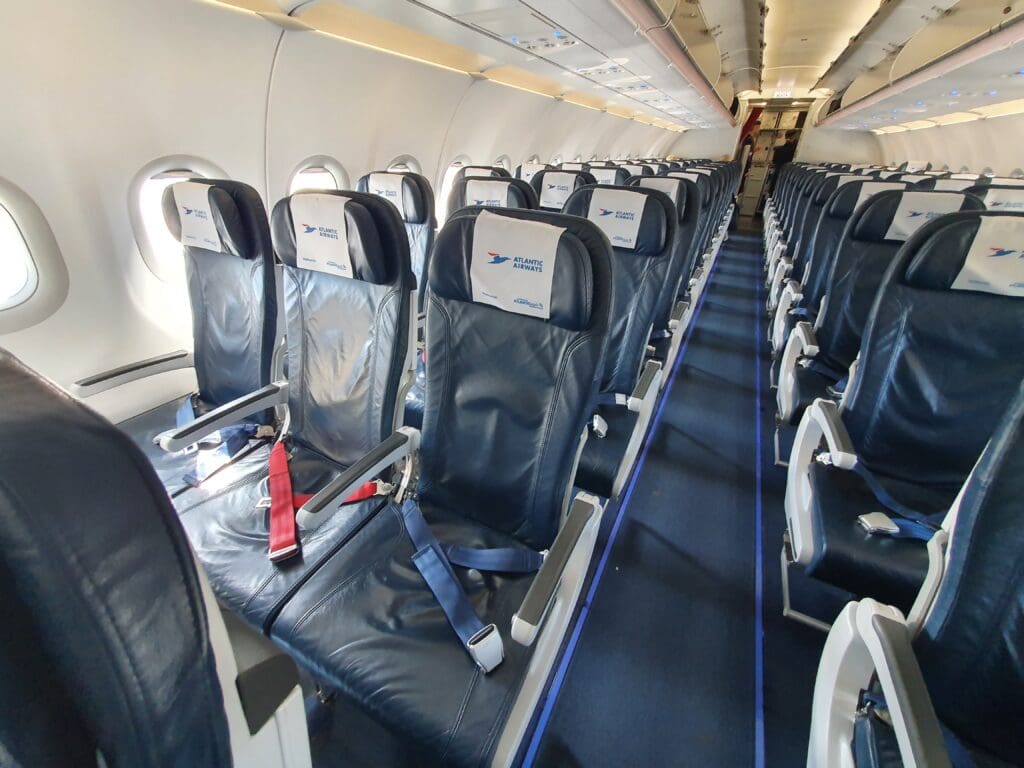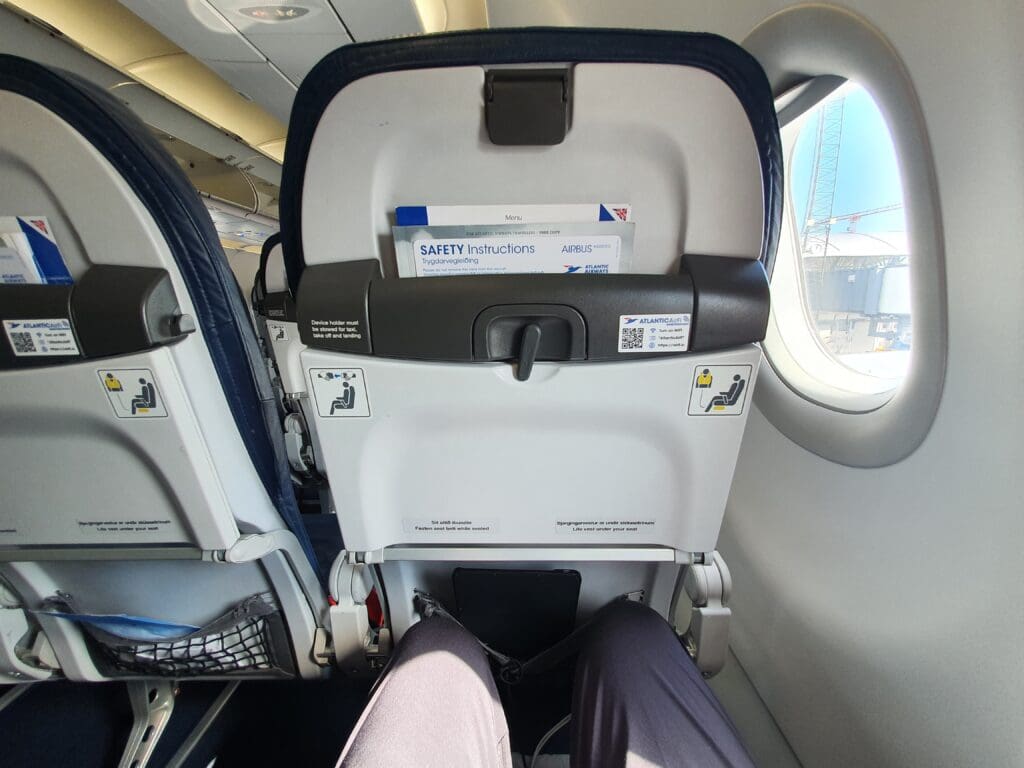 As I journeyed towards the rear of the aircraft Faroese songs blared out over the cabin speakers and received another friendly greeting from one of the flight attendants before arriving at Row 22. Being in the first cohort of passengers to board, at that time I was still to be joined by any neighbours so I slid into the seat with ease and settled down for the journey ahead. Upon sitting down, I was pleased to find the seat to be nice and comfortable – being reasonably well-padded and offering a fair amount of legroom. Inspecting the seat, the area around this appeared to be in good condition, with only minimal marks and scratches, however, I did notice some well-ingrained dirt and pen marks. Meanwhile, the seat came complete with the usual literature compartment and seatback pocket as well as a device holder. Whilst Atlantic Airways’ two Airbus A320neos feature USB-A ports allowing for inflight charging, these are unfortunately absent from their Airbus A320. Turning to the literature compartment, this contained a safety card, a buy-on-board menu and a copy of the airline’s Atlantic Review magazine.