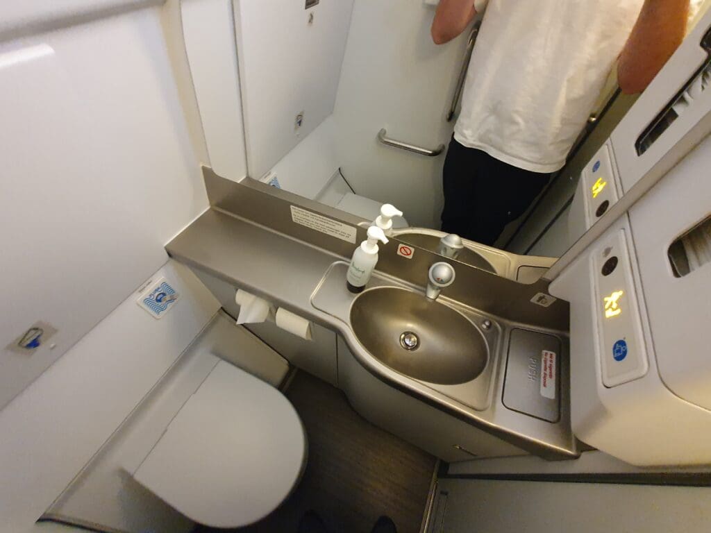 As if by magic, after around 15 minutes of some fairly heavy turbulence, the ride suddenly smoothed out and all would remain calm until we passed through the clouds on approach to Vágar. At this time, the aircraft was passing just to the north of the Shetland Islands’ northernmost isle, Unst, and after around five minutes of turbulence-free flying, the seatbelt signs were switched off. At this point, like many of my fellow flyers, I decided to pay a visit to one of the three lavatories onboard – with one located at the front of the cabin and two on either side at the rear of the cabin. Making my way to the back of the jet, after a few minutes of waiting I made my way into the toilet which I found to be in a clean condition, functional and stocked with all the basics that you would hope to find in an aircraft toilet.
