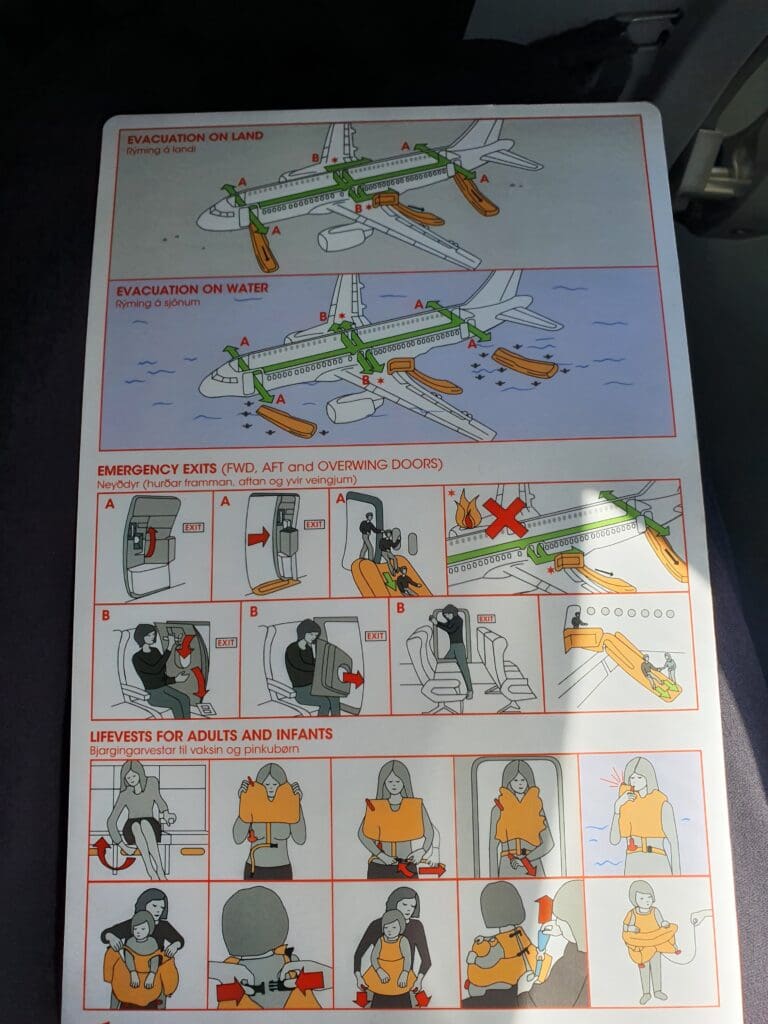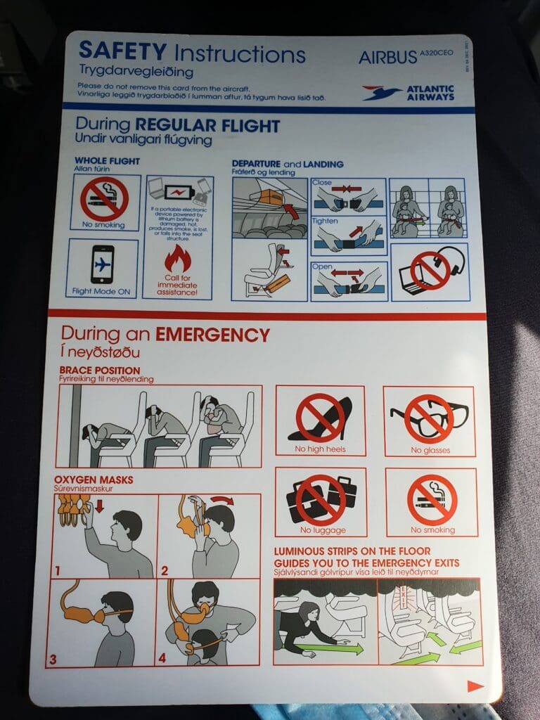 A short time after sitting down, a passenger joined me in the aisle seat and at 1215 boarding was announced as complete. That lunchtime, I would estimate the flight to have been around 75% full and it seemed that most other passengers were Danish tourists and foreign workers, and I failed to hear much Faroese spoken both at the gate and onboard the aircraft. Following a five-minute wait with little movement inside the cabin, at 1220 the Captain’s voice filled the cabin as they performed their welcome announcement in Faroese and English. During this, they mentioned the flight time and the weather en route before requesting passengers pay attention to the safety demonstration. This announcement was immediately followed by the Purser’s welcome announcement and the safety demonstration. Whilst Atlantic Airways does have a safety video, the latter took the form of the Purser reading through the safety instructions whilst several crew members performed a demonstration in the aisle.