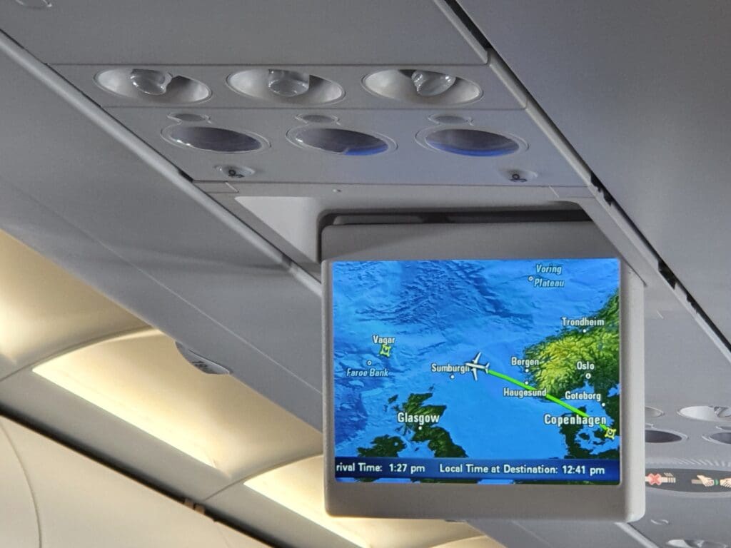 Seconds after leaving Copenhagen Airport and the island of Amager behind, the famous Øresund Bridge that connects Denmark with Sweden as well as the eastern portal of the Drogden Tunnel portal emerging from the sea could be seen. This was immediately followed by the island of Saltholm whilst Malmö and the Swedish coastline could be seen several kilometres away in the distance. Soon turning to fly northwest, it wasn’t long before the Airbus crossed over the Danish coastline and climbed over Copenhagen’s far northern suburbs, namely Hellerup, Gentofte and Lyngby. Inside the cabin, at 1238 the seatbelt signs were switched off as we climbed through 10,000 feet at which point an announcement was made advising passengers to keep these fastened whilst seated, before moving on to mention the soon-to-commence inflight service and Atlantic Airways’ Atlantic AirFi entertainment streaming. Ploughing onwards through the skies above North Zealand, the aircraft passed over the towns of Lillerød, Hillerød and Helsinge before leaving the Capital Region behind and crossing the blue waters of the Kattegat. After this announcement had been made, the overhead screens positioned at intervals of every few aisles on each side of the cabin dropped down and began broadcasting the moving map.