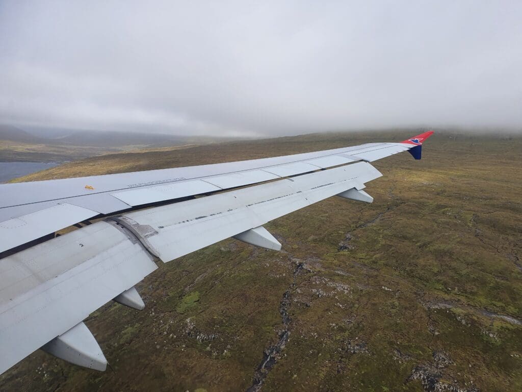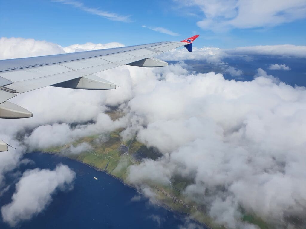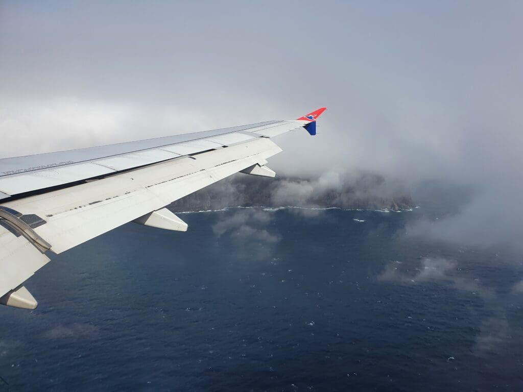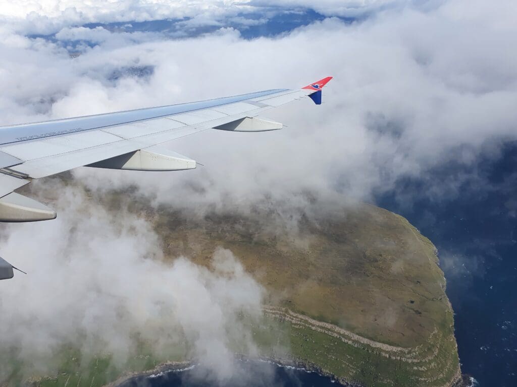 Around halfway between the Shetlands and the Faroes, at 1302 local time the aircraft could be felt leaving its cruising altitude and beginning its journey back to Earth. At this time I spotted an aircraft whizzing past in the opposite direction which thanks to the magic of modern-day flight tracking apps I later worked out to be an Icelandair Boeing 737 MAX 8 making its way from Keflavík to Bergen. As the Airbus approached the islands, the clouds below temporarily parted revealing the blue waters of the North Atlantic and gave me hope that a picturesque cloud-free introduction to the Faroe Islands would be in store. At 1308 the Captain performed their pre-arrival speech in Faroese and English during which they mentioned that we could expect to be on the ground by 1325 before noting that as the wind was blowing from the south (and thus across Vágar Airport’s runway), we would likely be subject to some turbulence during the last few minutes of the flight. Several minutes later, the Purser performed a standard pre-arrival announcement which contained the usual warnings regarding seatbelts, tray tables, seatbacks and tray tables.